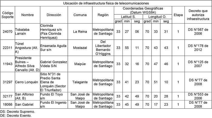 1. Autorízase a la concesionaria para modificar su concesión, individualizada en la letra g) de los Vistos, en el sentido de incorporar infraestructura física ya autorizada, conforme a los decretos que se detallan en el siguiente cuadro: