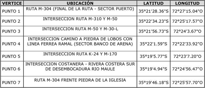 2. El límite del radio urbano de la ciudad de Constitución, estará comprendido por la unión imaginaria de los siguientes vértices, en base al sistema de referencias de coordenadas geográficas WGS84: