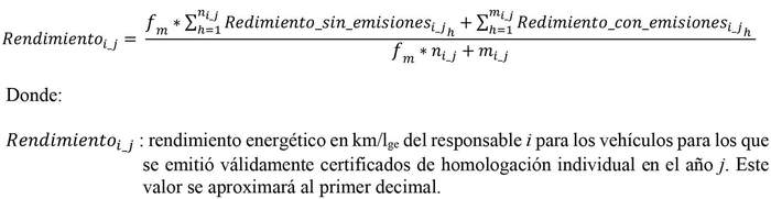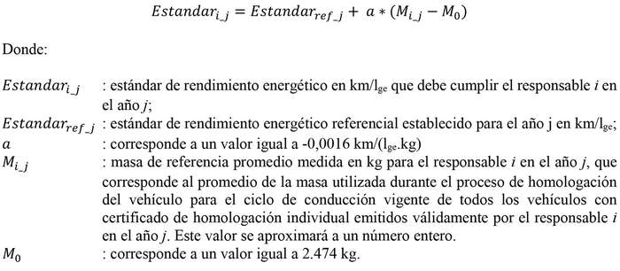 El estándar mínimo de eficiencia energética vehicular deberá ser anualmente determinado por el Ministerio de Transportes y Telecomunicaciones para cada uno de los responsables de su cumplimiento, en función de los vehículos con certificado de homologación individual emitidos válidamente por cada responsable, según lo establece la fórmula anterior.