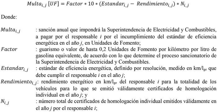 9. Sanciones. Según lo indicado en el inciso sexto del literal h) del artículo 4 del decreto ley Nº 2.224, la sanción que impondrá la Superintendencia de Electricidad y Combustibles por el incumplimiento del estándar de eficiencia energética será una multa de hasta 0,2 Unidades de Fomento por cada décima de kilómetro por litro de gasolina equivalente por debajo del estándar indicado en la presente resolución en el año correspondiente, multiplicado por el número total de certificados de homologación individual emitidos válidamente por el responsable en el año respectivo.