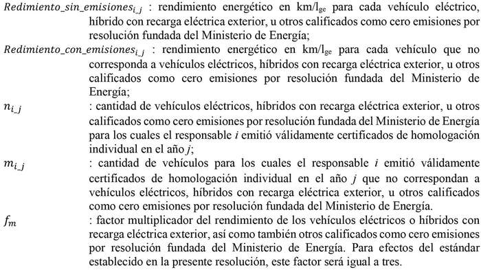 11. Multiplicador. De acuerdo con lo indicado en el inciso octavo del literal h) del artículo 4 del decreto ley Nº 2.224, para determinar el nivel de cumplimiento del estándar de eficiencia energética, se podrá contar hasta tres veces cada vehículo eléctrico o híbrido con recarga eléctrica exterior, así como también otros calificados como cero emisiones por resolución fundada del Ministerio de Energía. De esta manera, el rendimiento anual de cada responsable se establecerá según la siguiente expresión: