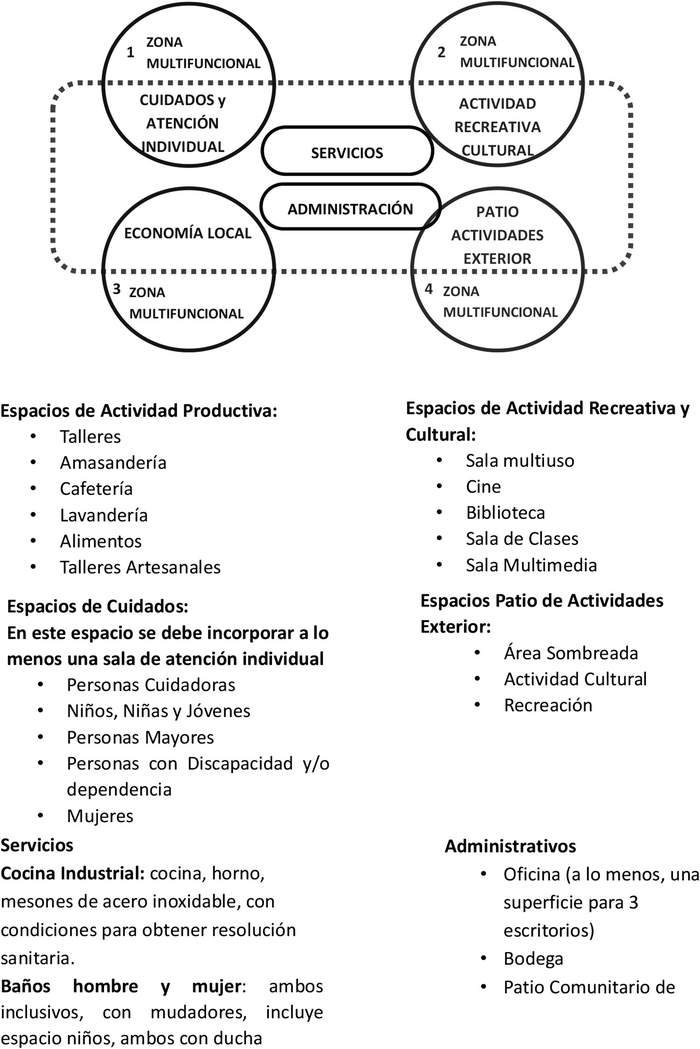 b) Los tipos de obras serán Centros Comunitarios de Cuidados y deberán garantizar la simultaneidad de actividades, tanto para la persona cuidadora como para quien recibe cuidados. Por esta razón los programas descritos en el Anexo 4 deben contar con separaciones tales como: tabiquería, puertas plegables, puertas correderas, entre otras alternativas, para garantizar dicha simultaneidad programática; en el baño se debe garantizar un espacio para la implementación de un mudador de adulto (camilla), así como también deberán contar con cocina, horno y mesones industriales que les permitan obtener resolución sanitaria.