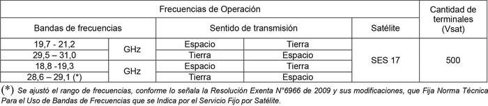 1. Autorízase a la concesionaria para ampliar la asignación de frecuencias y características de estaciones terrenas, de acuerdo al siguiente detalle:
