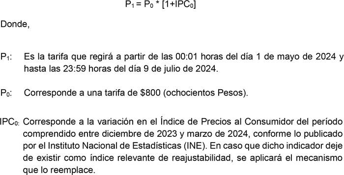 3.1 A partir de las 00:01 horas del día 1 de mayo de 2024 y hasta las 23:59 horas del día 9 de julio de 2024, regirá la Tarifa por Pasajero Embarcado que resulte de aplicar el siguiente reajuste: