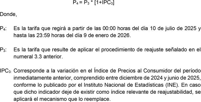 3.4 A partir de las 00:00 horas del día 10 de julio de 2025 y hasta las 23:59 horas del día 9 de enero de 2026, regirá la Tarifa por Pasajero Embarcado que resulte de aplicar el siguiente reajuste: