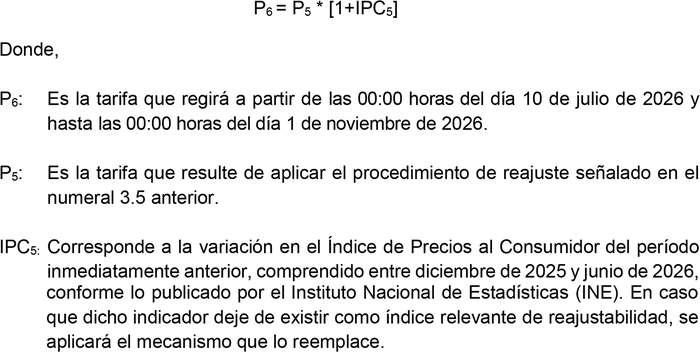 3.6 A partir de las 00:00 horas del día 10 de julio de 2026 y hasta las 00:00 horas del día 1 de noviembre de 2026, regirá la Tarifa por Pasajero Embarcado que resulte de aplicar el siguiente reajuste:
