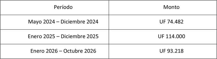 8. Establécese que, durante el período de prórroga del plazo de la concesión, en el evento que la sumatoria de todos los ingresos recaudados por la Sociedad Concesionaria, tanto por concepto de pasajeros embarcados como por la prestación y explotación de los servicios aeronáuticos y/o no aeronáuticos, o cualquier otro, durante los periodos comprendidos entre los meses de mayo y diciembre de 2024, los meses de enero y diciembre de 2025 y los meses de enero y octubre de 2026, según corresponda, sea inferior a las cantidades indicadas en el cuadro Nº 1 siguiente, la Sociedad Concesionaria tendrá derecho a una compensación por dicho diferencial, mediante la revisión del sistema tarifario, de su fórmula de reajuste, o del plazo de la Concesión, o bien mediante un pago directo, pudiendo utilizarse uno o más de esos factores a la vez.