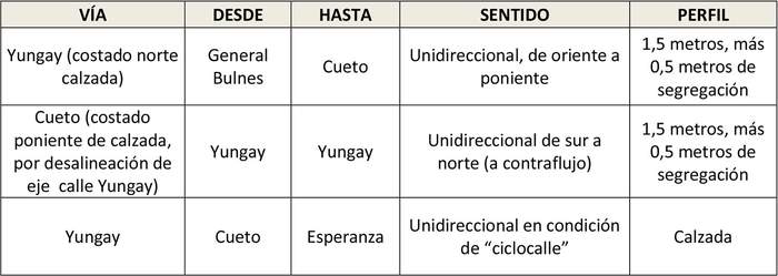 8.- Que, sin perjuicio de lo señalado en el referido anteproyecto y memoria explicativa y, habiendo realizado esta Secretaría Regional una reevaluación de todos los antecedentes, estima que la extensión de la presente ciclovía en el tramo comprendido entre calle Cueto y Esperanza, no resulta ser la alternativa más apropiada para la seguridad vial, toda vez que presenta estacionamientos y parada de buses. Por lo anterior y, atendido los principios de servicialidad, celeridad y economía procedimental, se estima conveniente en este caso, disponer un cambio en parte del diseño original de la ciclovía.