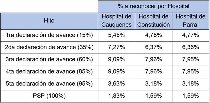 Para tal efecto, con fecha del último día del mes en que el Inspector Fiscal apruebe, para el Establecimiento de Salud respectivo, la correspondiente declaración de avance establecida en el artículo 1.9.6 de las Bases de Licitación, o con fecha del último día del mes en que se autorice, para el Establecimiento de Salud respectivo, la Puesta en Servicio Provisoria que trata el artículo 1.10.3 de las Bases de Licitación, según sea el caso, se reconocerá el monto que resulte de multiplicar el respectivo porcentaje señalado en la tabla precedente, por el monto establecido en el numeral 2.3 del presente Convenio (UF 887.103).