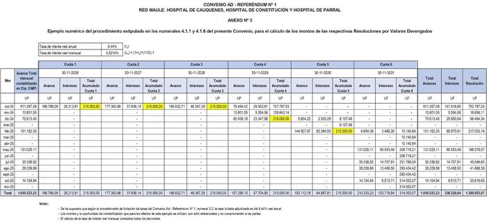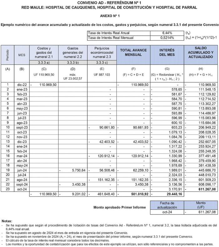 Para tales efectos, el informe antes señalado deberá incluir el cálculo de los intereses devengados mensualmente hasta el último día del mes anterior a la entrega del citado informe, y del avance acumulado y actualizado de los mayores costos, gastos y perjuicios que deban ser reconocidos hasta dicha fecha, conforme al ejemplo numérico que se adjunta como Anexo Nº 1 al presente Convenio.
