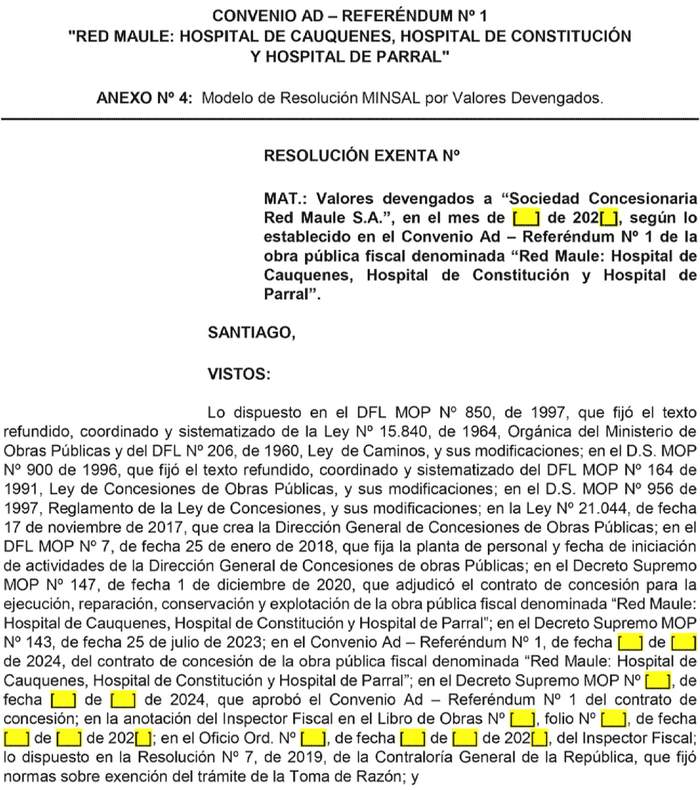 - El decreto supremo MOP Nº 147, de fecha 1 de diciembre de 2020, que adjudicó el contrato de concesión para la ejecución, reparación, conservación y explotación de la obra pública fiscal denominada "Red Maule: Hospital de Cauquenes, Hospital de Constitución y Hospital de Parral".