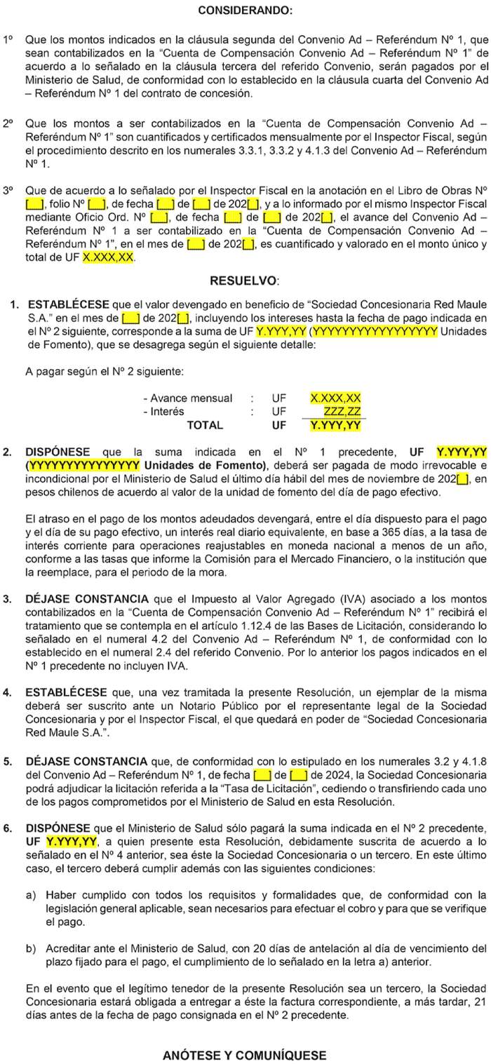 En virtud de lo anterior, MINSAL pagará las Resoluciones, a su vencimiento, al tercero que sea el legítimo tenedor de las mismas o, en caso contrario, a la Sociedad Concesionaria. Estas Resoluciones no podrán ser prepagadas por MINSAL, salvo con el consentimiento del legítimo tenedor de la respectiva resolución, esto es, la Sociedad Concesionaria o el adquirente de éstas.