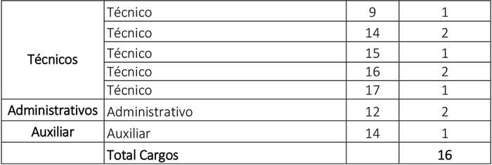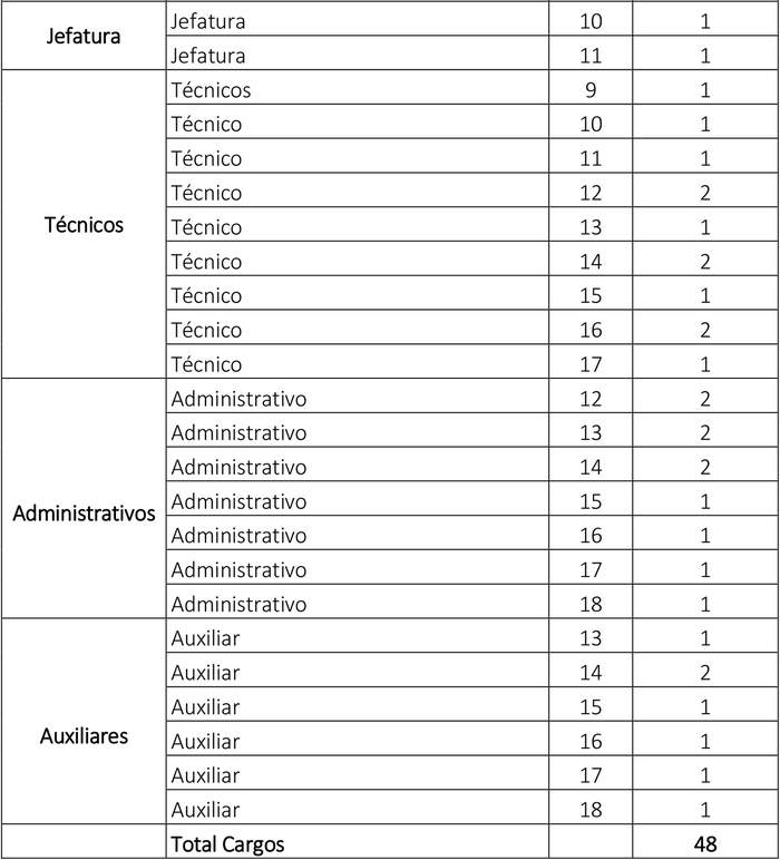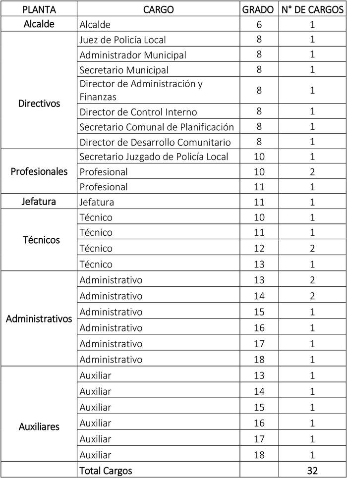 12. Que, se contempla la creación en el escalafón profesional dos cargos grado 9° y un cargo grado 11°;  en el escalafón jefaturas, un cargo en grado 10°; en el escalafón de técnicos, un cargo en grado 9°, dos cargos grado 14°, un cargo grado 15°, dos cargos grado 16°, un cargo grado 17°; en el escalafón de administrativos, dos cargos grado 12°; y en el escalafón de auxiliares, un cargo en grado 14°, para efectos de  fortalecer unidades y departamentos actuales en la organización interna municipal que requieren una mayor dotación de funcionarios, con la sola misión para ejercer sus funciones de manera profesional, eficaz y eficientemente.