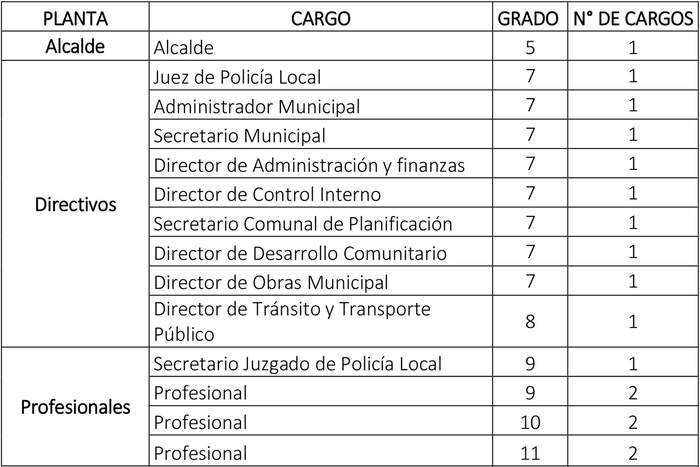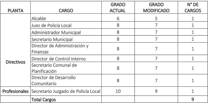 18. Que, se modifica el grado de grado 8° a 7°,  de los cargos denominados como "unidades mínimas", a saber, Secretaría Municipal, Secretaría Comunal de Planificación, Director de Desarrollo Comunitario, Director de Administración y Finanzas; y Director de Control Interno, en virtud de lo dispuesto en el artículo 16 inciso tercero de la Ley N° 18.695 Orgánica Constitucional de Municipalidades, el cual dispone que "dichos cargos tendrán dos grados inmediatamente inferiores a aquel que le corresponde al alcalde en la municipalidad respectiva".