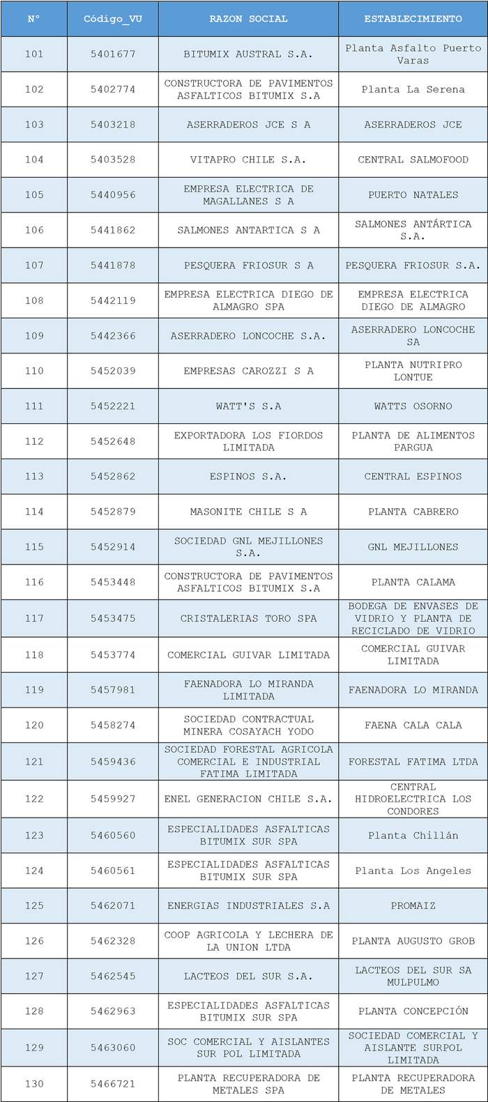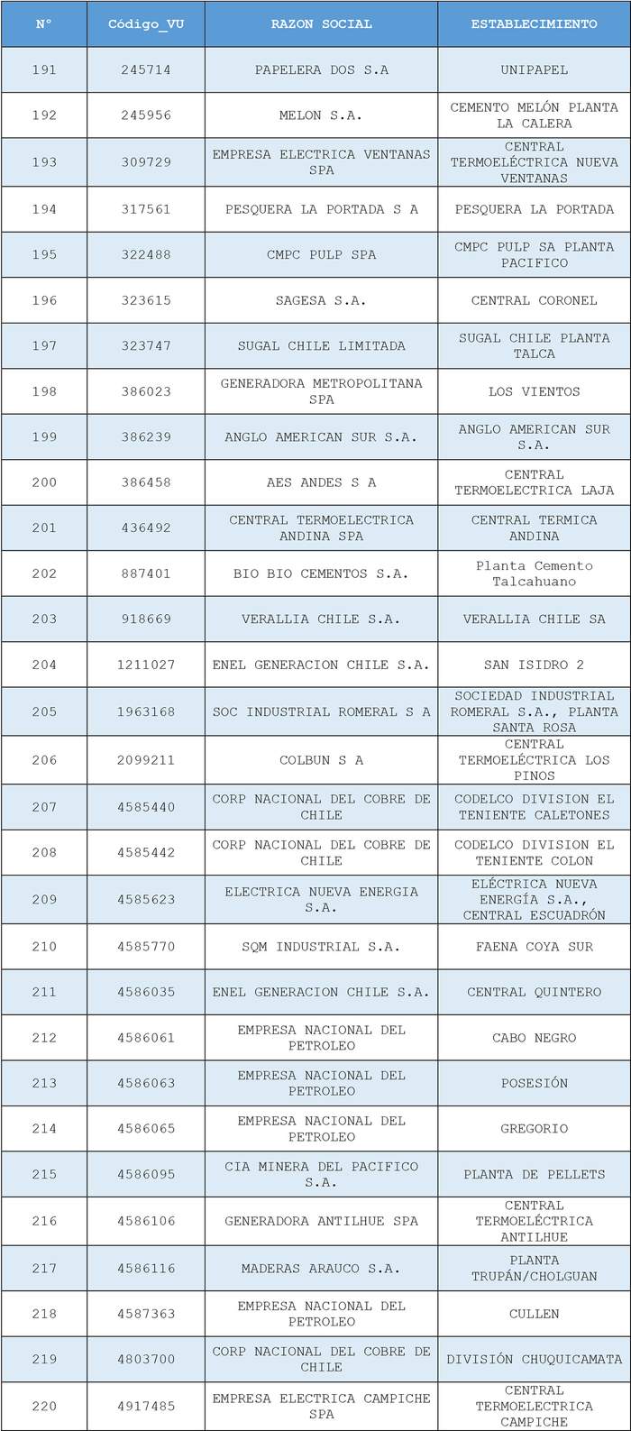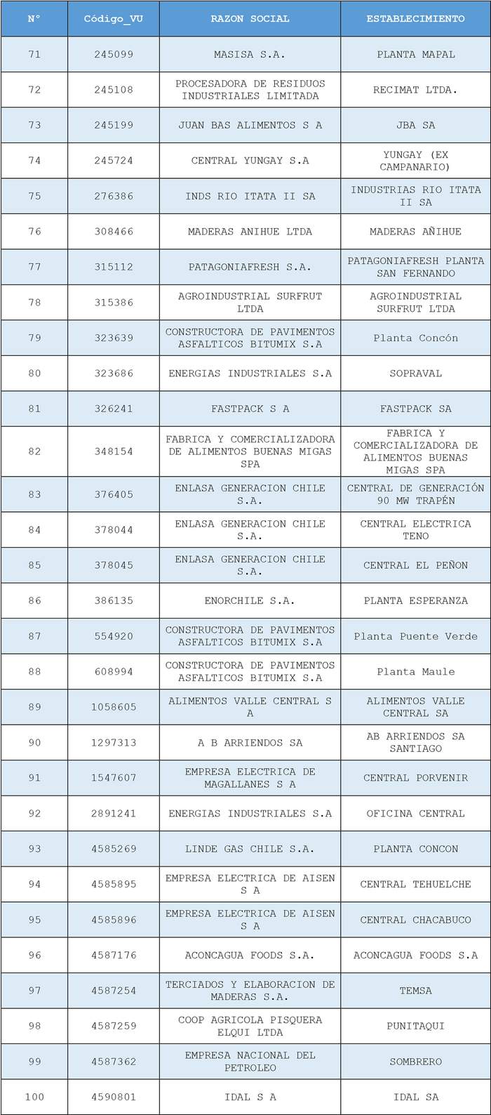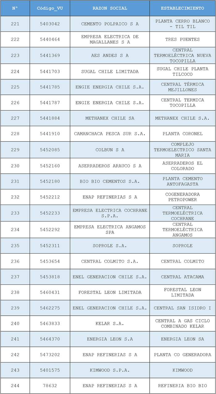 1.- Establézcase el siguiente listado de establecimientos sujetos a la obligación de reportar sus emisiones, de conformidad a lo dispuesto en los artículos 10 y 11 del decreto supremo Nº 63, de 2022, del Ministerio del Medio Ambiente: