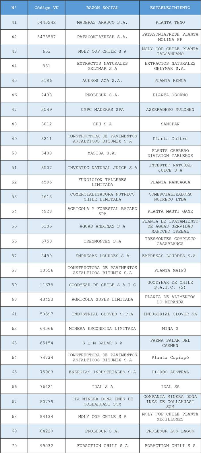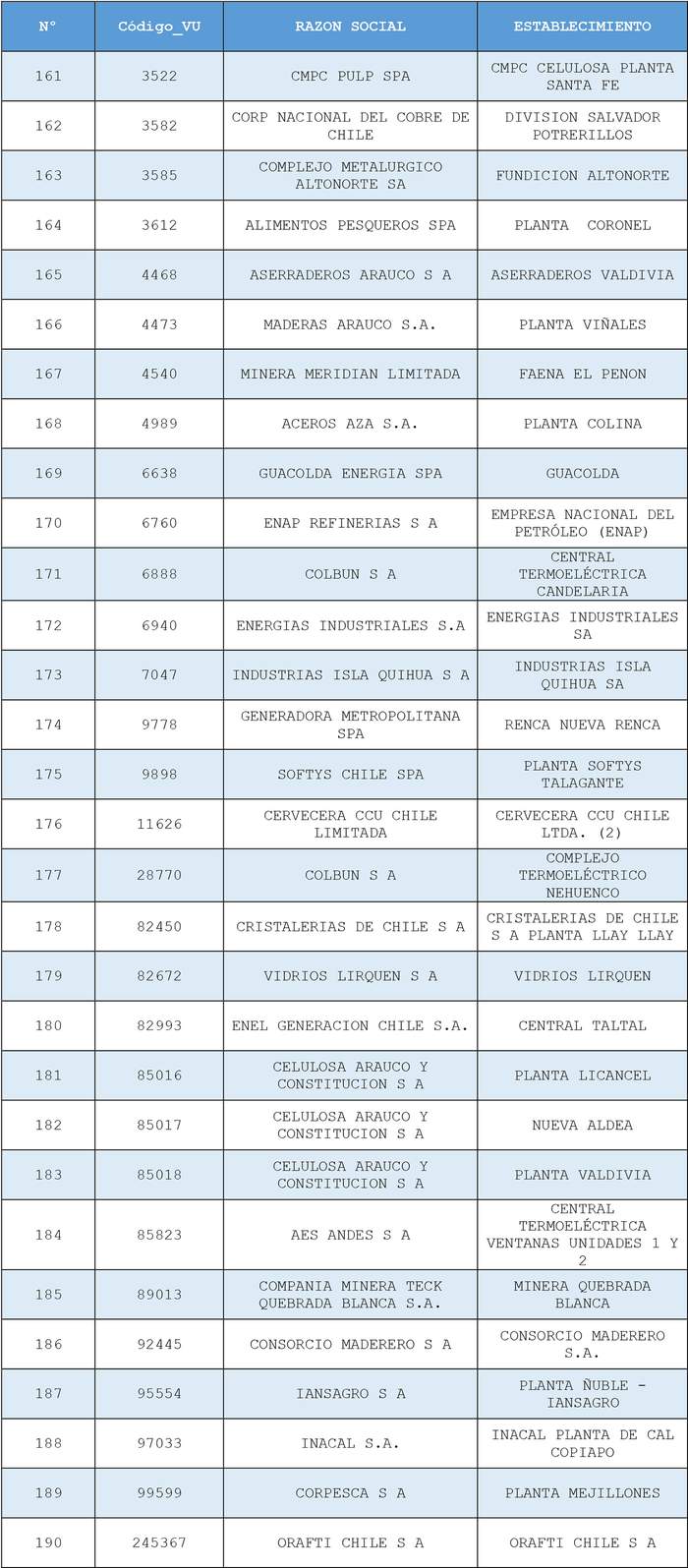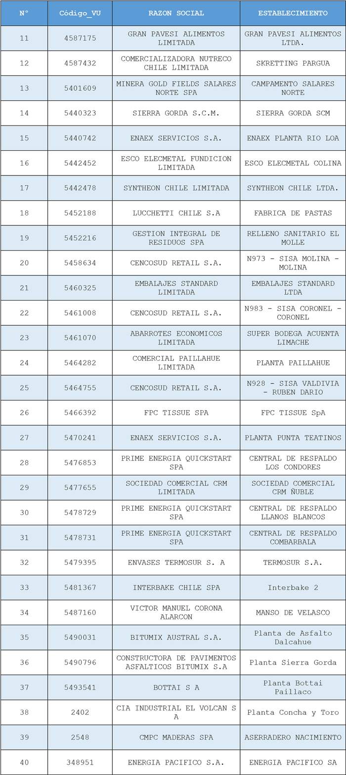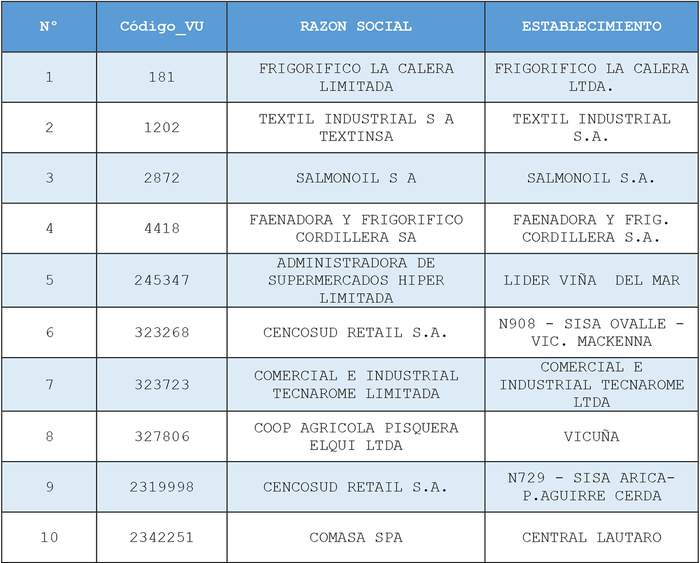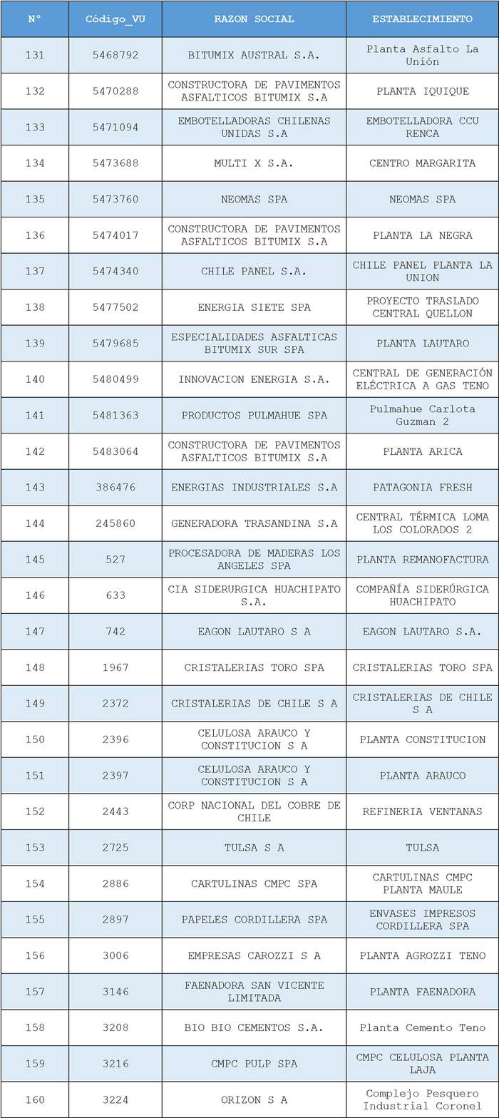 1.- Establézcase el siguiente listado de establecimientos sujetos a la obligación de reportar sus emisiones, de conformidad a lo dispuesto en los artículos 10 y 11 del decreto supremo Nº 63, de 2022, del Ministerio del Medio Ambiente: