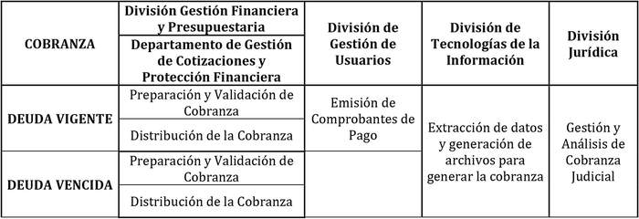 El Departamento de Gestión de Cotizaciones y Protección Financiera / Subdepto. de Cobranza recibe la información de pago, el Subdepto. de Tesorería valida los pagos y la División de Tecnologías de la Información ingresa los pagos de forma masiva al sistema de préstamos.
