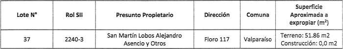 1. Que, por medio del ordinario del Serviu de la Región de Valparaíso, citado en la letra h) de los V istos de este decreto, se solicitó a esta Cartera de Estado la elaboración de un decreto supremo que apruebe el Programa de expropiaciones de la Región de Valparaíso, para el proyecto "Mejoramiento Avda. Alemania Etapa 2", en la comuna de Valparaíso, requiriéndose expropiar una superficie de terreno de 51,86 mts. cuadrados, correspondiente al inmueble denominado Lote 37, Sector Camino Cintura, Pasaje Floro Nº 117, comuna de Valparaíso.