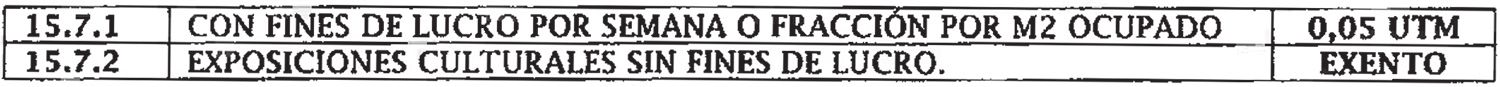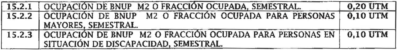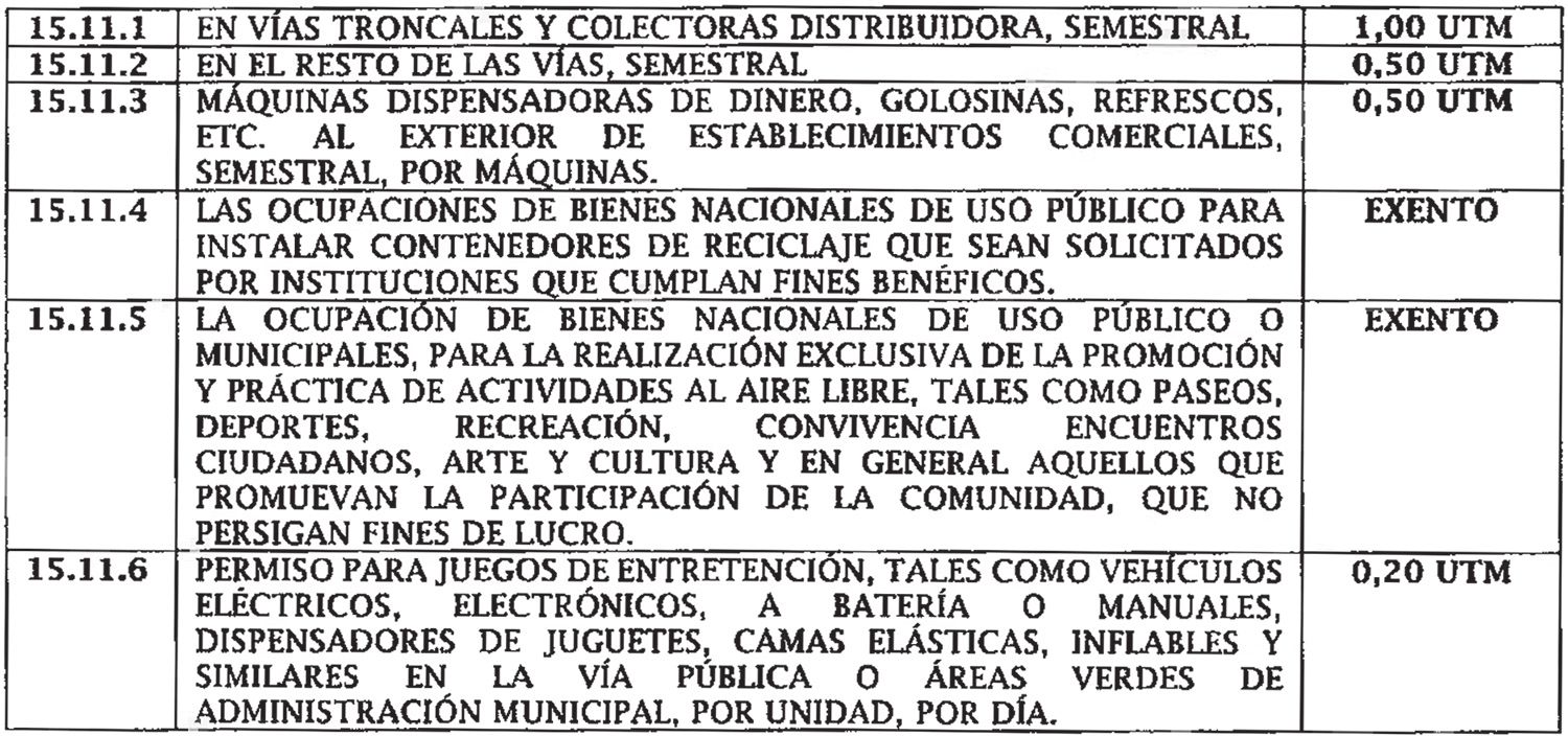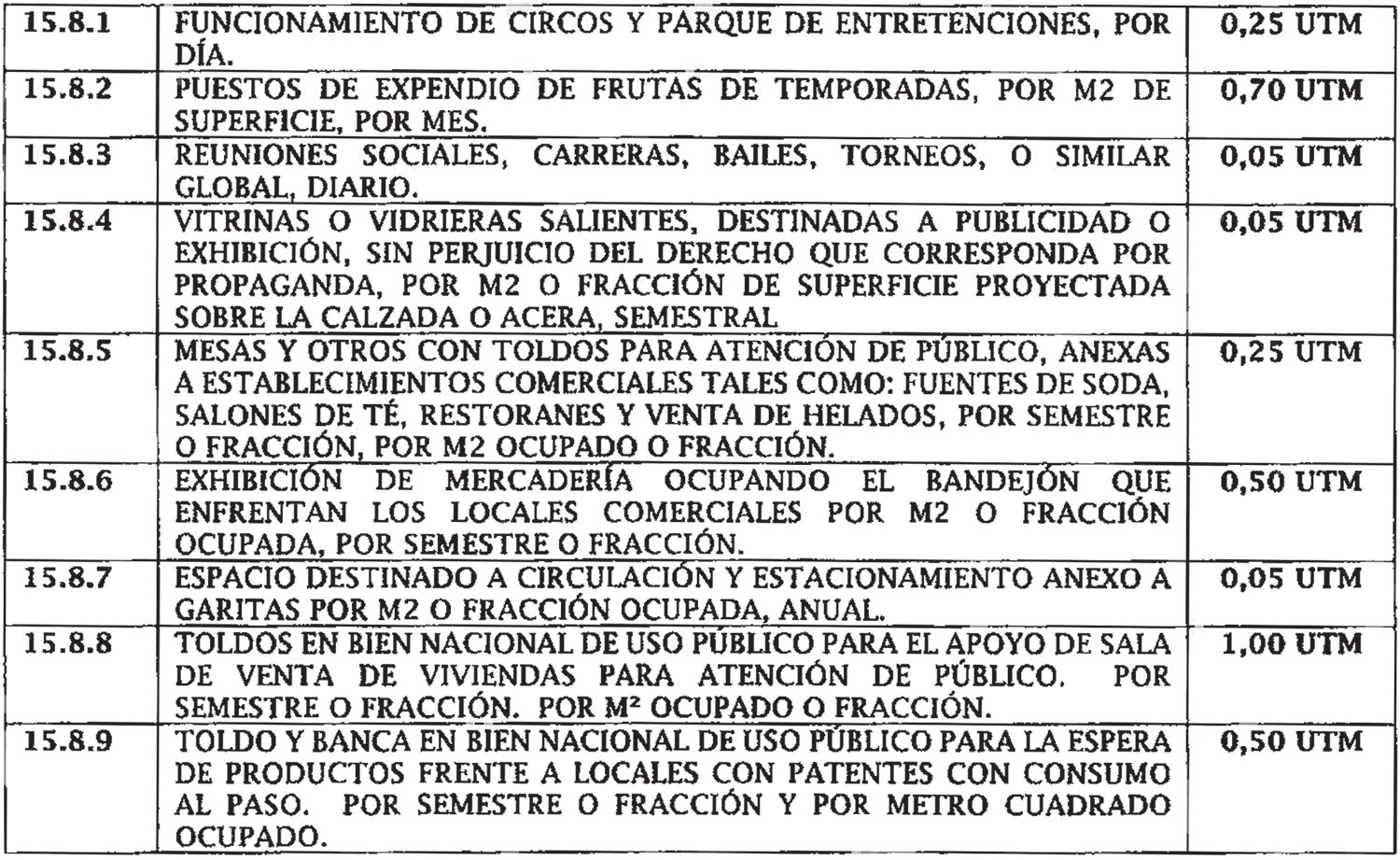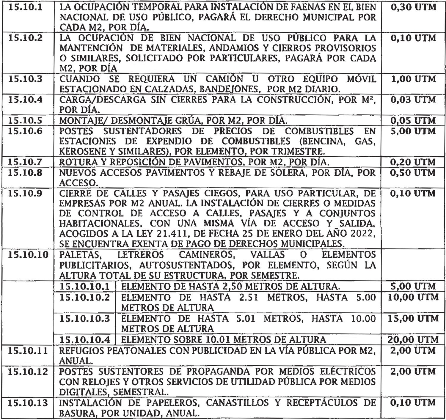 Artículo Nº 15.- El permiso para ocupación de bienes nacionales de uso público, pagará los derechos municipales que se señalan, sin perjuicio de la contribución que, por patentes municipales o permisos correspondientes.