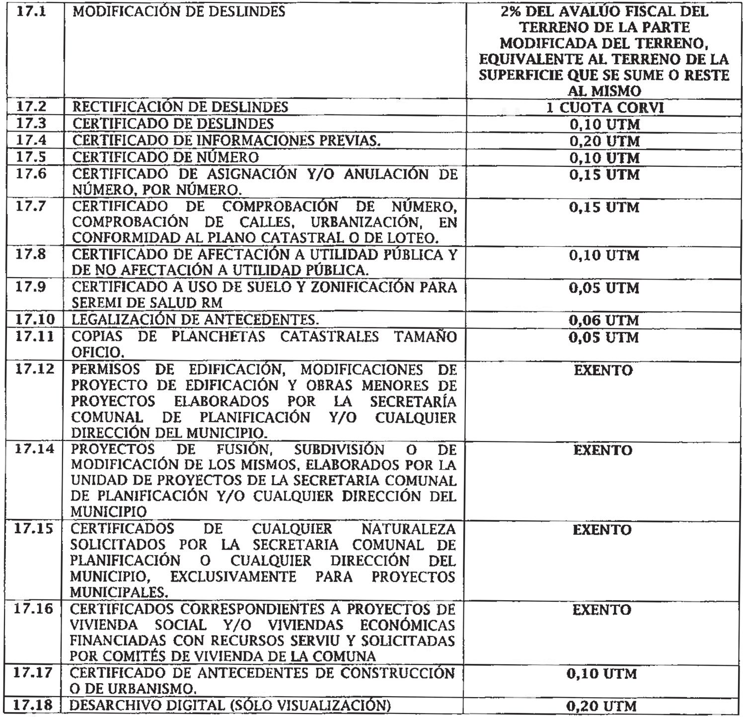 Artículo 17.- Los servicios, concesiones o permisos relativos a la urbanización y construcción que se señalan más adelante, pagarán los valores que para cada caso se indican, en conformidad a lo dispuesto en el Art. 130 de la Ley General de Urbanismo y Construcciones, contenida en el decreto supremo Nº 450 del Minvu publicada en el Diario Oficial del 13 de abril de 1976.