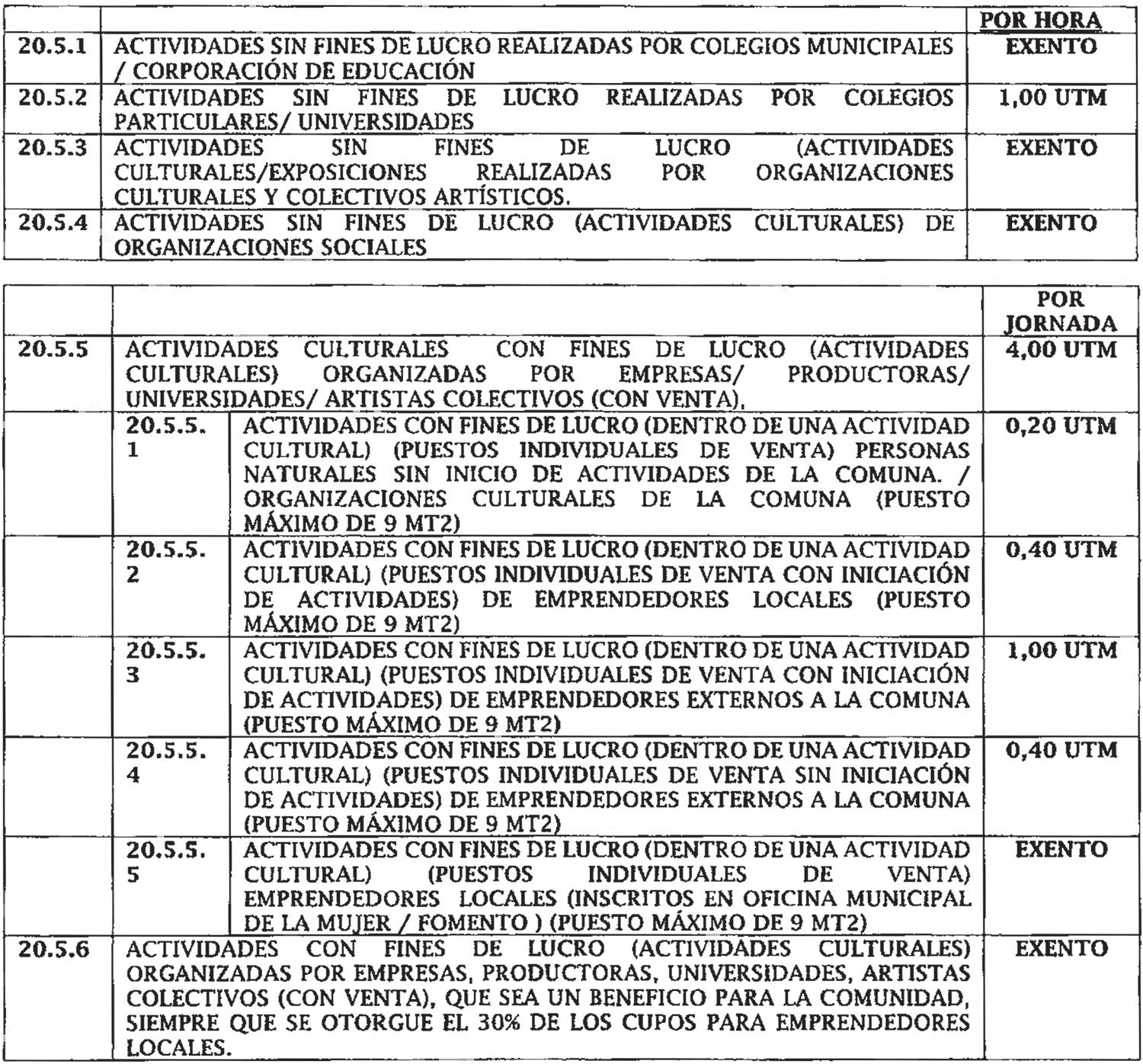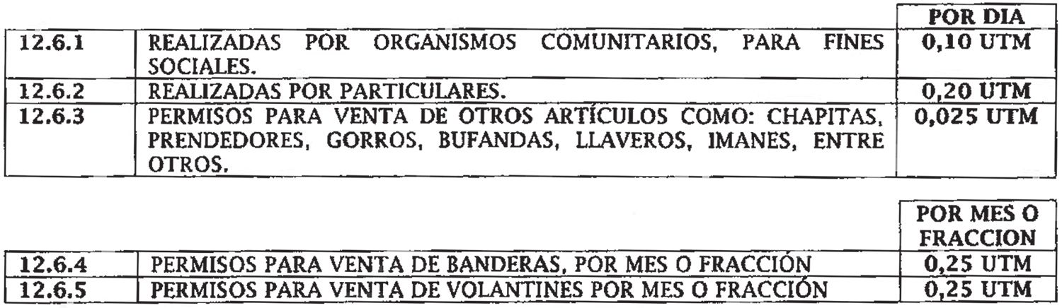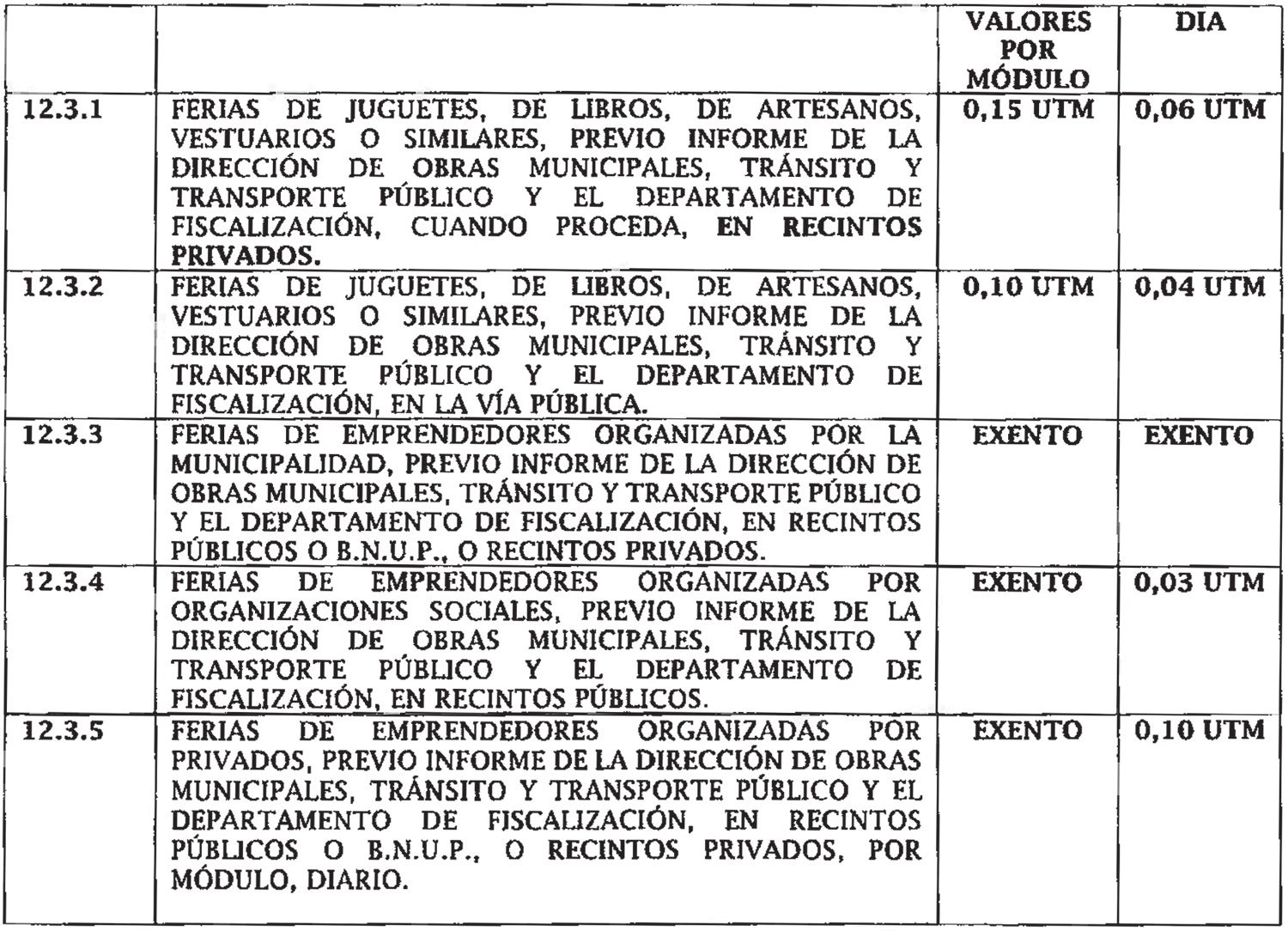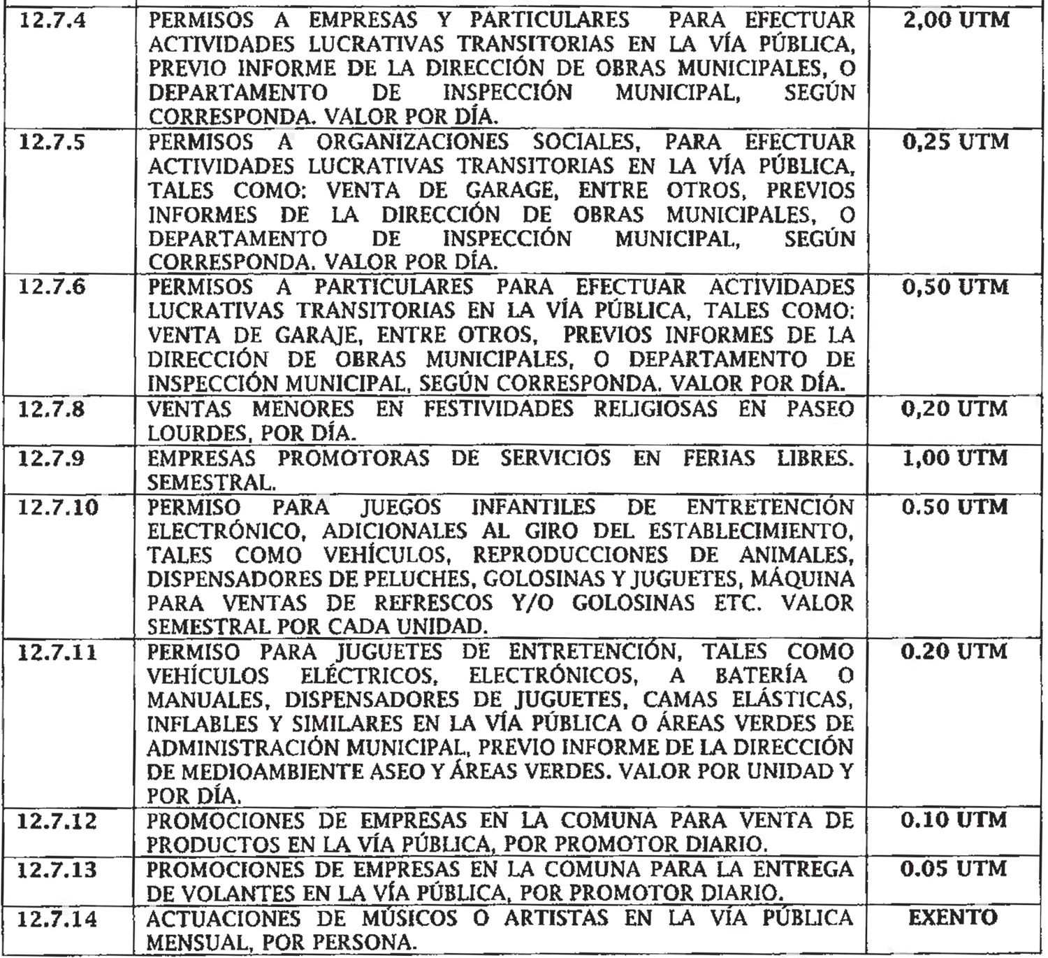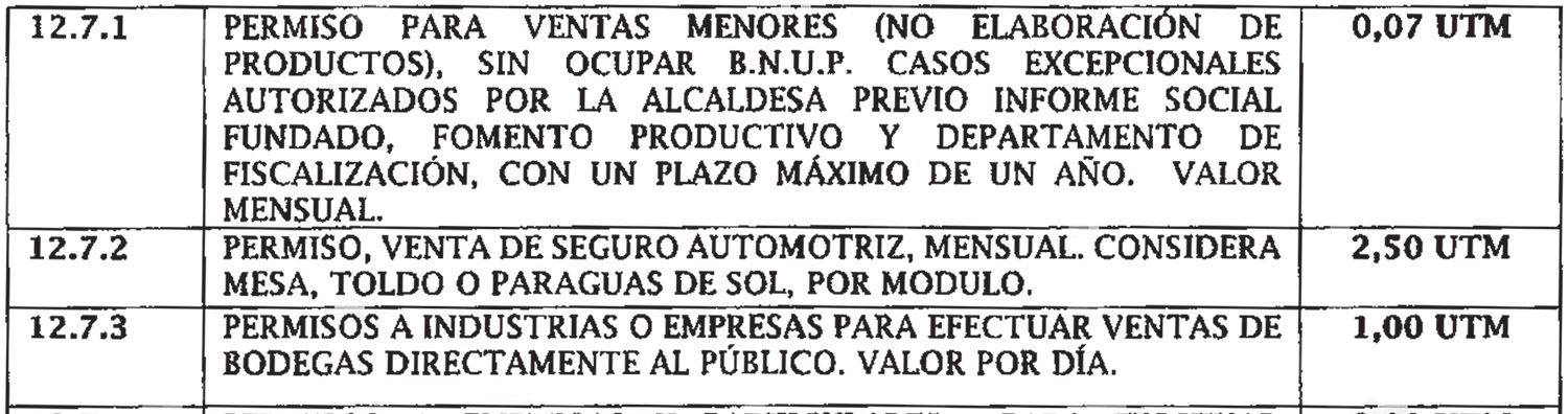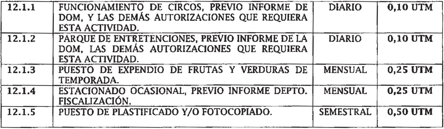 Artículo 12.- El otorgamiento de permisos para el ejercicio transitorio de actividades lucrativas, pagará los siguientes valores, además del derecho por ocupación de B.N.U.P., cuando corresponda.