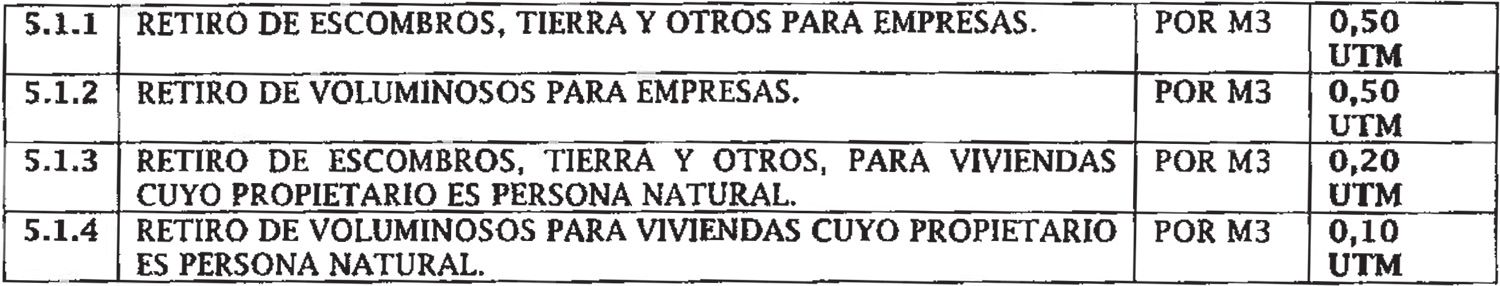 Artículo 5.- Retiros de escombros y podas . Los servicios ordinarios y especiales por extracción de basuras, escombros y otros, pagarán los valores que se indican más adelante.