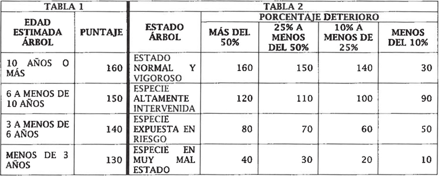 La suma de los puntajes determinados según tablas 1 y 2, representan el ítem del derecho a pagar por el daño sufrido por la especie ar bórea.