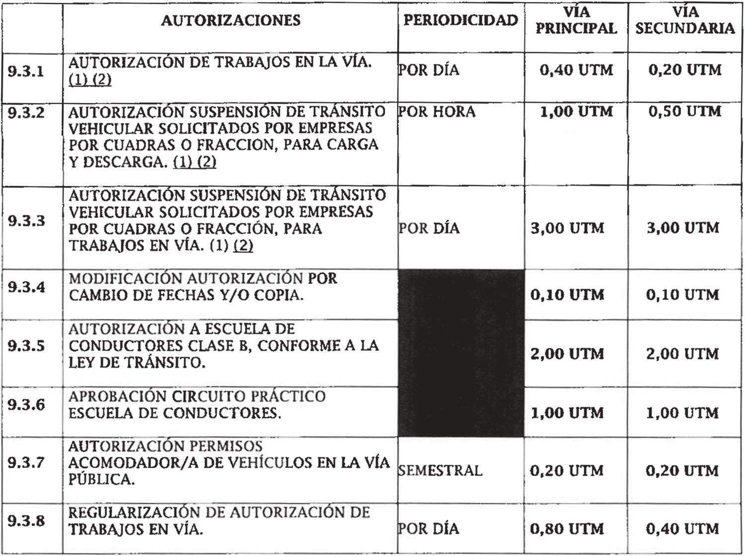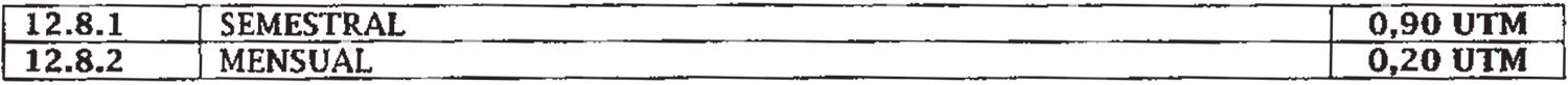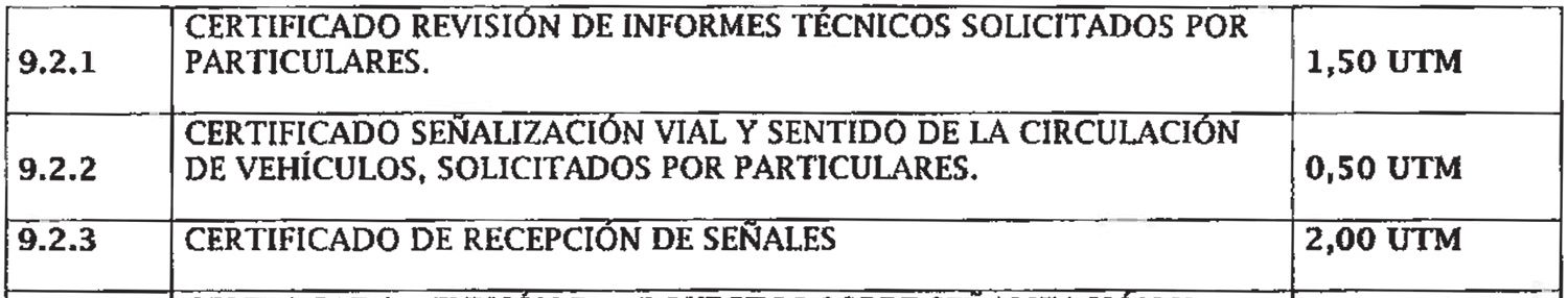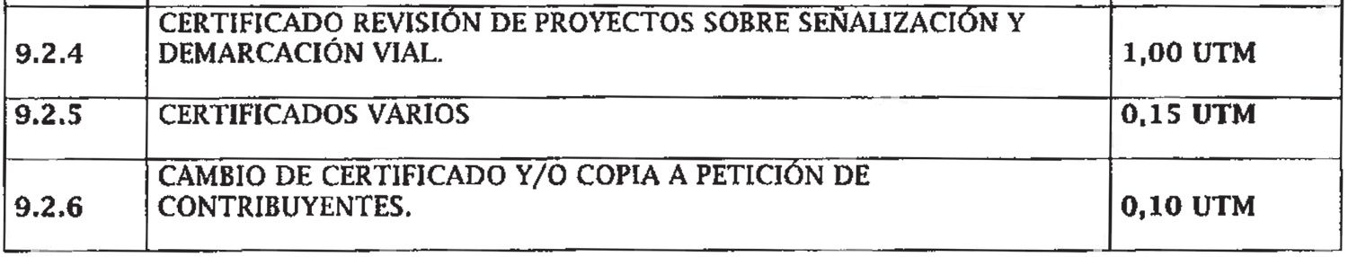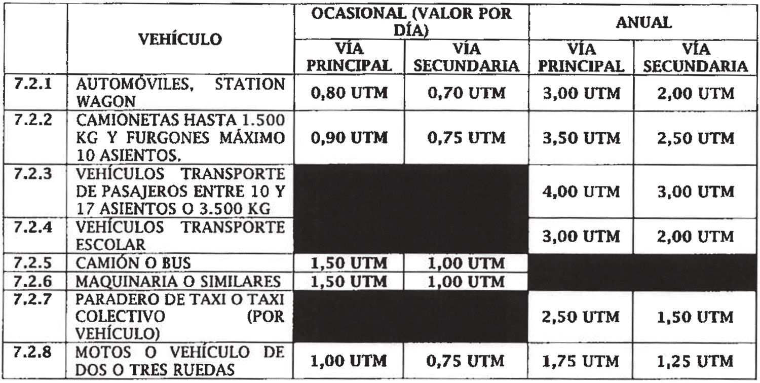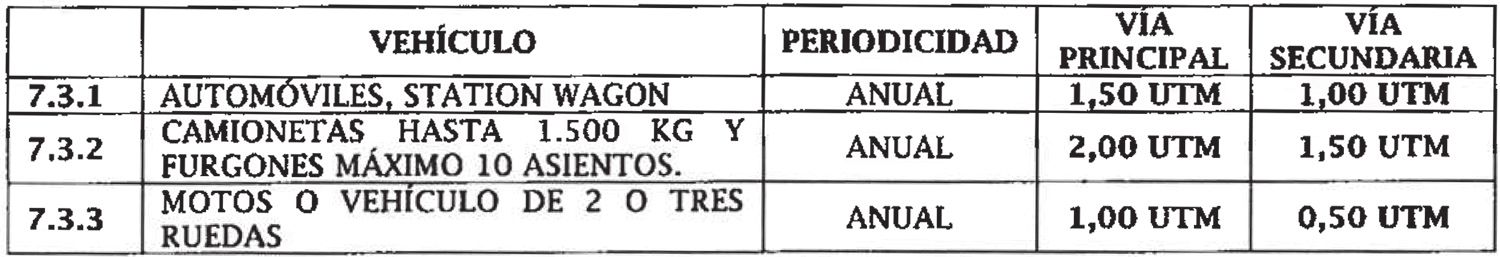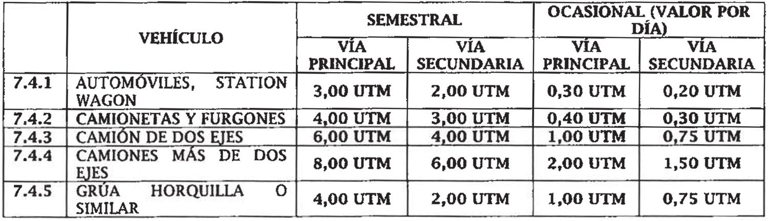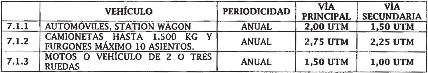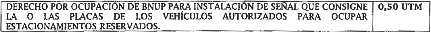 Artículo 7.- Estacionamiento . El permiso para estacionamiento reservado de vehículos o para carga o descarga de carácter ocasional, transitorio o permanente, en bienes nacionales de uso público, debidamente regulado por las disposiciones de la Ley de Tránsito y autorizado por el Departamento de Ingeniería y Estudios de la Dirección de Tránsito, incluido el certificado y credencial respectiva, estará gravado con los siguientes derechos anuales, salvo indicación específica, expresados en UTM.