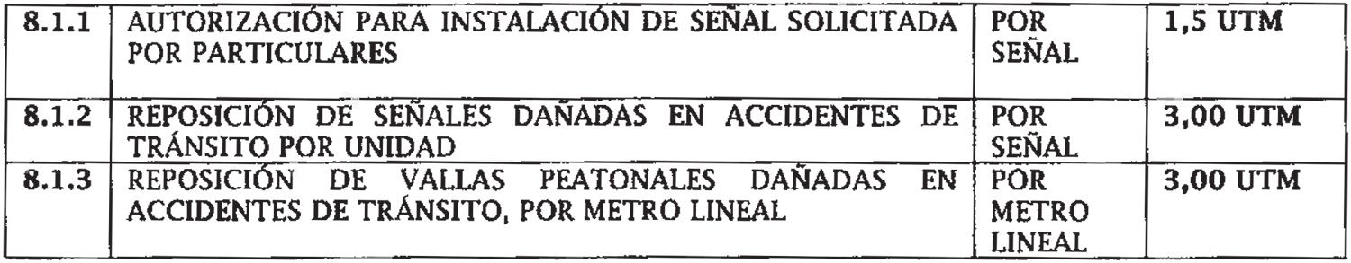 Artículo 8.- Los derechos para instalación de señales a petición de particulares y por su reposición en caso de daño ocasionado por terceros, se girarán a través del Departamento de Ingeniería y Estudios, ajustados a la tabla siguiente: