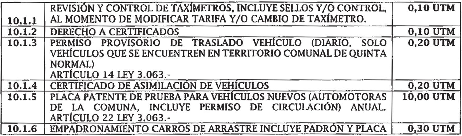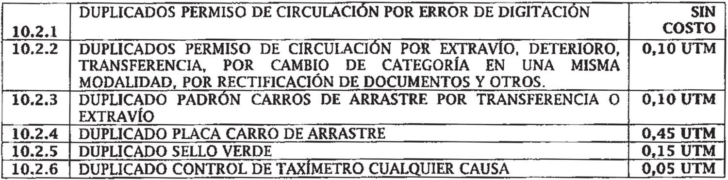Artículo 10.- Permisos de circulación : Los servicios prestados por el Departamento de Permisos de Circulación estarán afectos a los siguientes derechos: