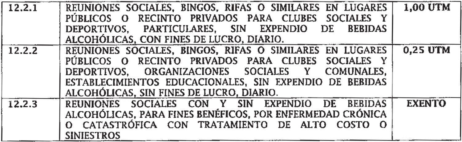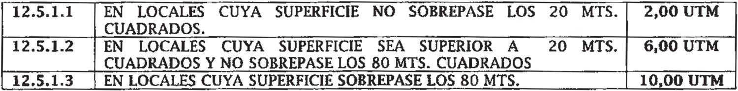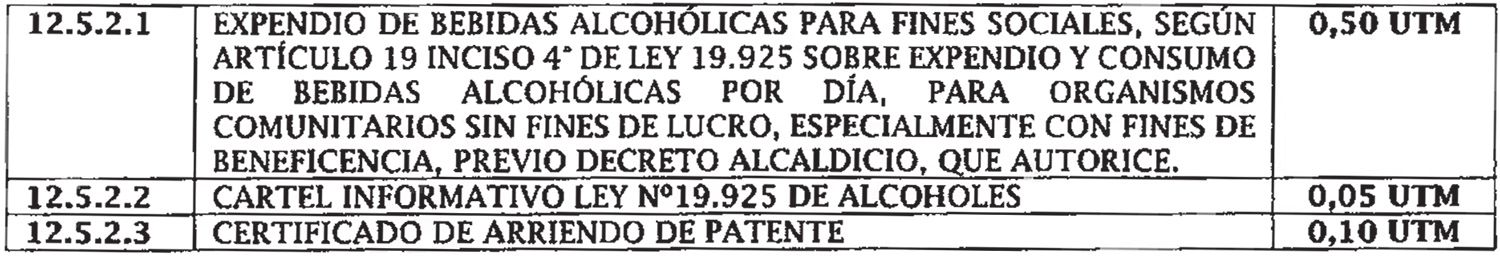 12.5.1.- Fondas y otros locales, según Art 19 inciso 4º de la ley 19.925 sobre expendio y consumo de bebidas alcohólicas, por tres días, previo decreto alcaldicio que autorice.