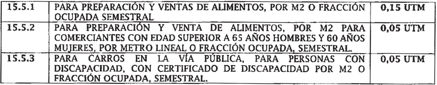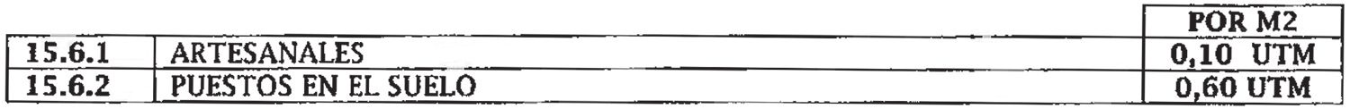 15.11.- Elementos sobrepuestos, complementarios al comercio, tales como: Letreros tipo A, contenedores, maquinarias de expendio, etc., previa autorización de la dirección de obras y dirección de tránsito, por m2 de su proyección en el B.N.U.P.