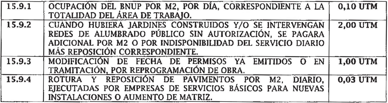 15.9.- La ocupación temporal de espacio público por faenas relacionadas con instalaciones de servicios públicos tales como: Agua, alcantarillado, electricidad, gas, teléfono, telecomunicaciones, transmisión de señales y datos, y otros similares: