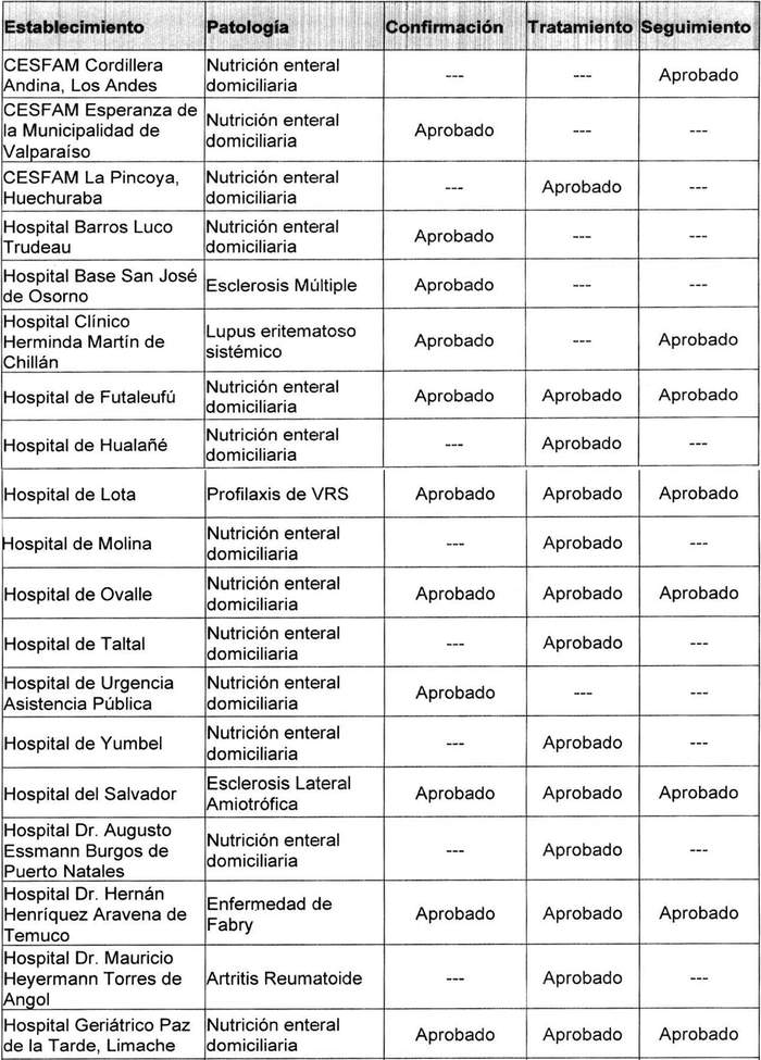 1º Apruébase a los siguientes establecimientos para formar parte de la red de prestadores que otorgarán las prestaciones cubiertas por el sistema de protección financiera de la ley Nº 20.850, por dar cumplimiento a los estándares exigidos para estos efectos en la Norma Técnica Nº 207, del Ministerio de Salud: