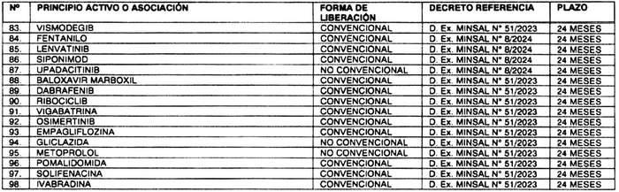 a) Otórguese un plazo de 24 meses, para cumplir con la exigencia de presentación de estudios de Equivalencia Terapéutica ante el Instituto de Salud Pública de Chile, para los productos farmacéuticos registrados que contengan los "Principios Activos" o "Asociaciones" y bajo la "Forma de Liberación", que a continuación se indican: