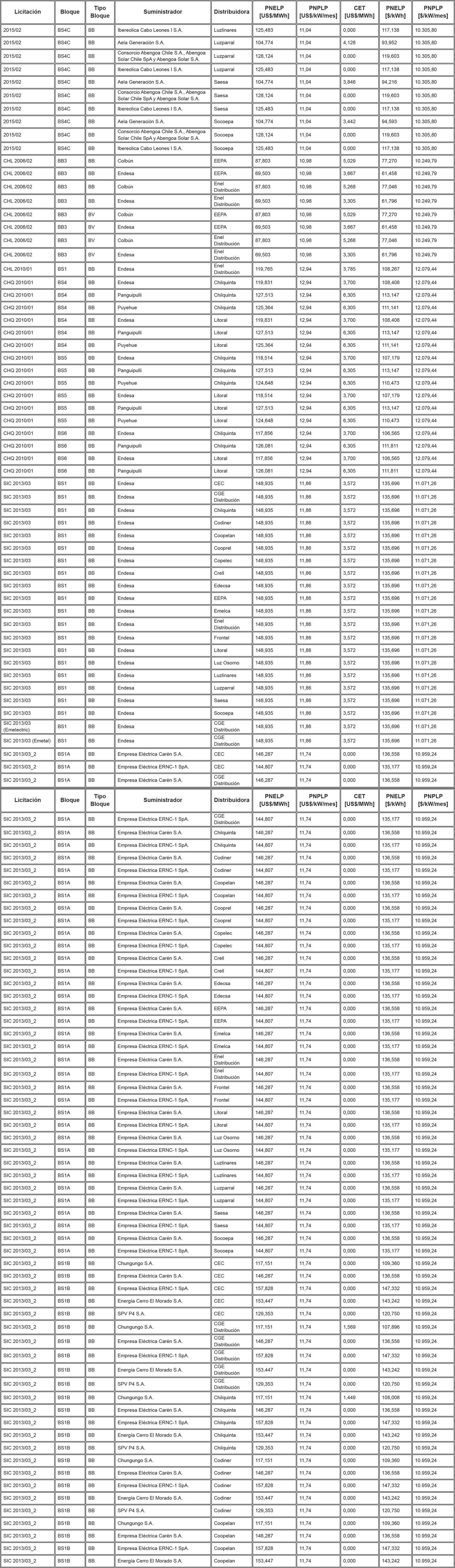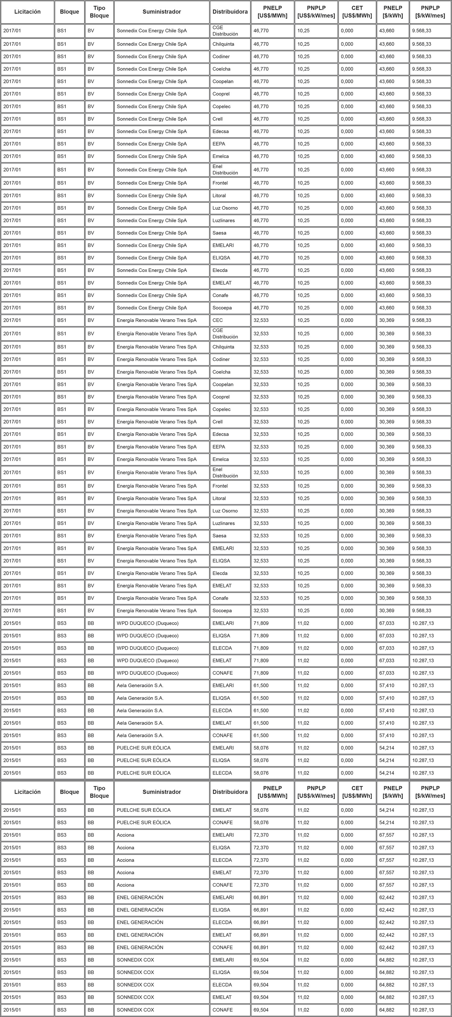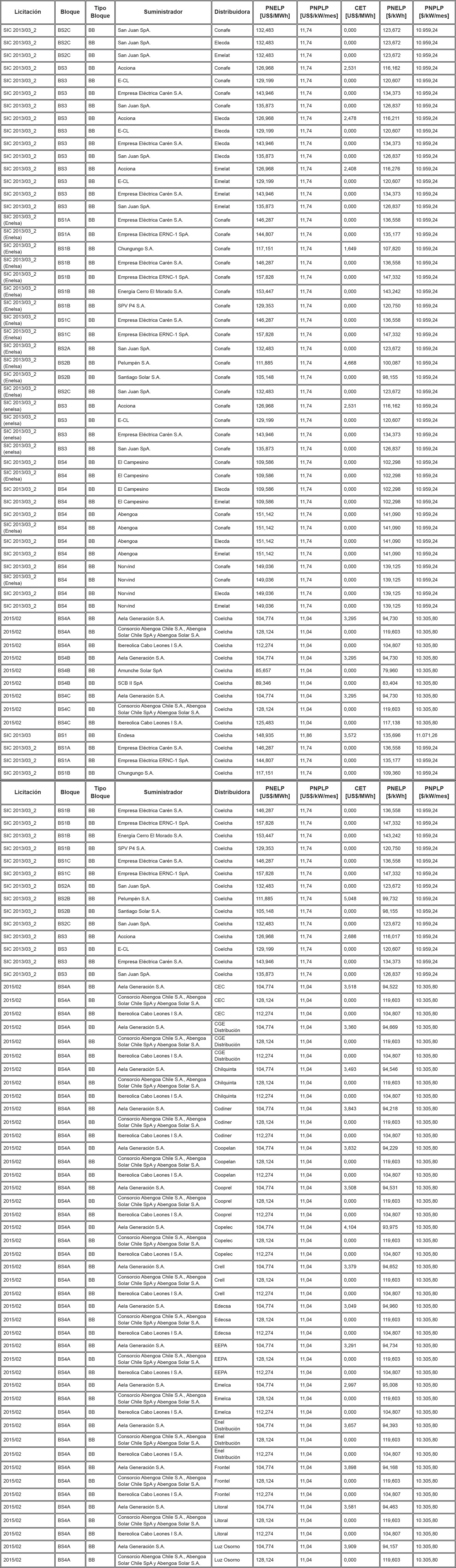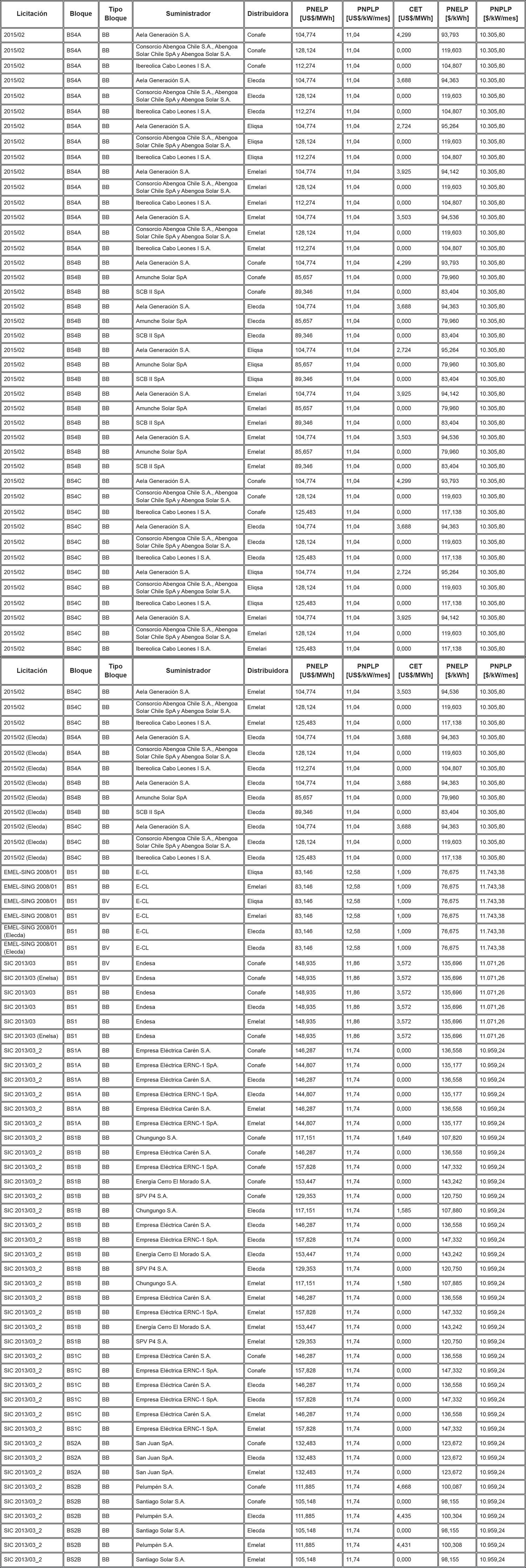Los Precios de Nudo de Largo Plazo de energía y potencia, de acuerdo con lo señalado en los artículos 6° y 11° de la resolución exenta N° 703, y los descuentos del monto del Cargo Equivalente de Transmisión Final ("CET") en el precio total de energía de los contratos modificados de acuerdo a lo señalado en el artículo vigesimoquinto transitorio, letra E. Numeral i., de la ley N° 20.936 y en la resolución exenta N° 7, son los que se indican en la siguiente tabla: