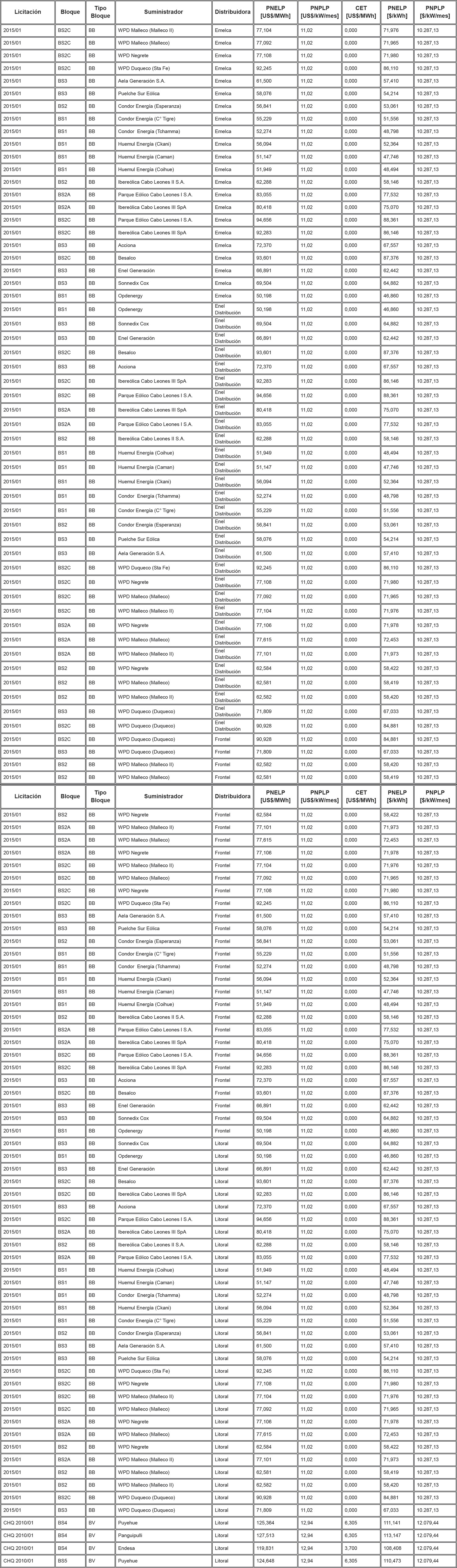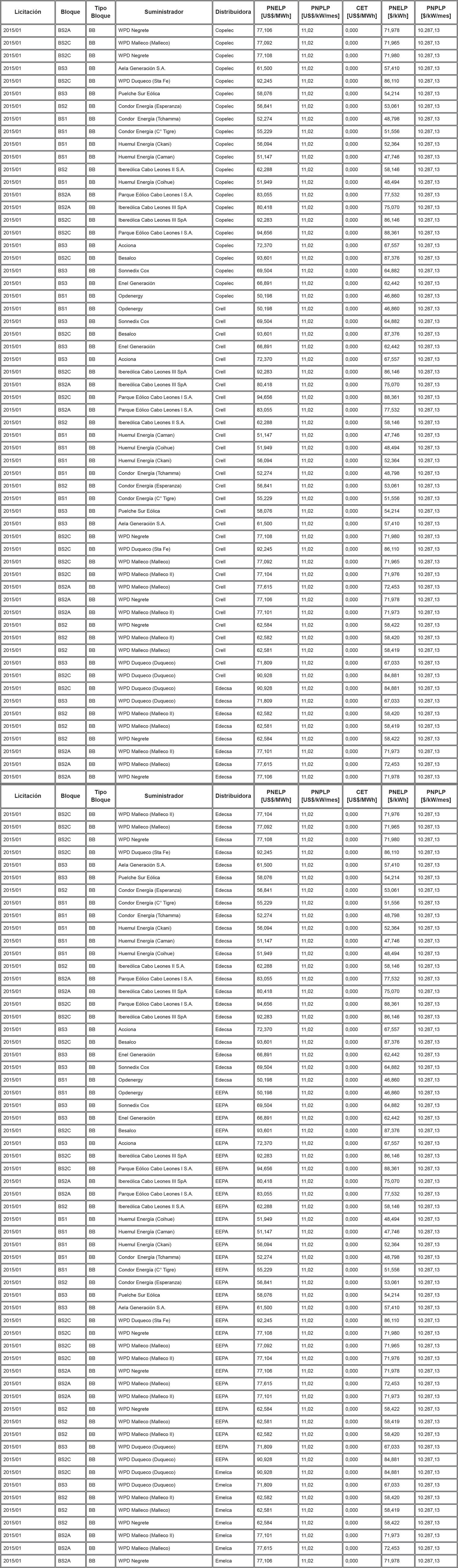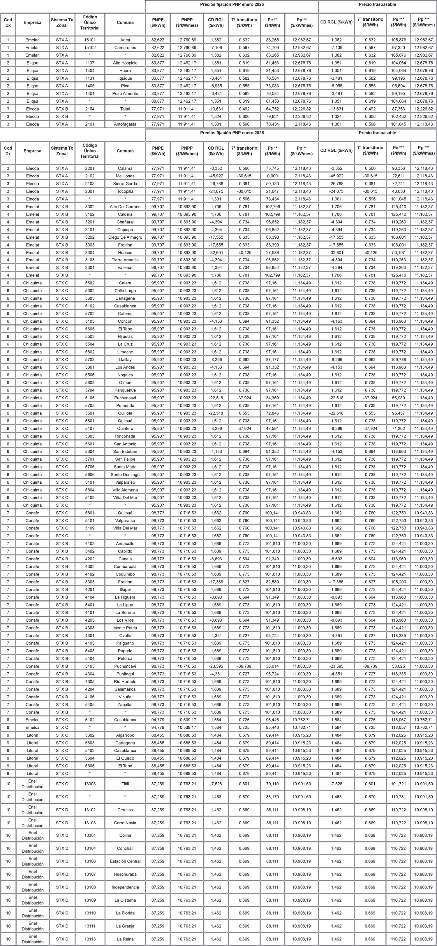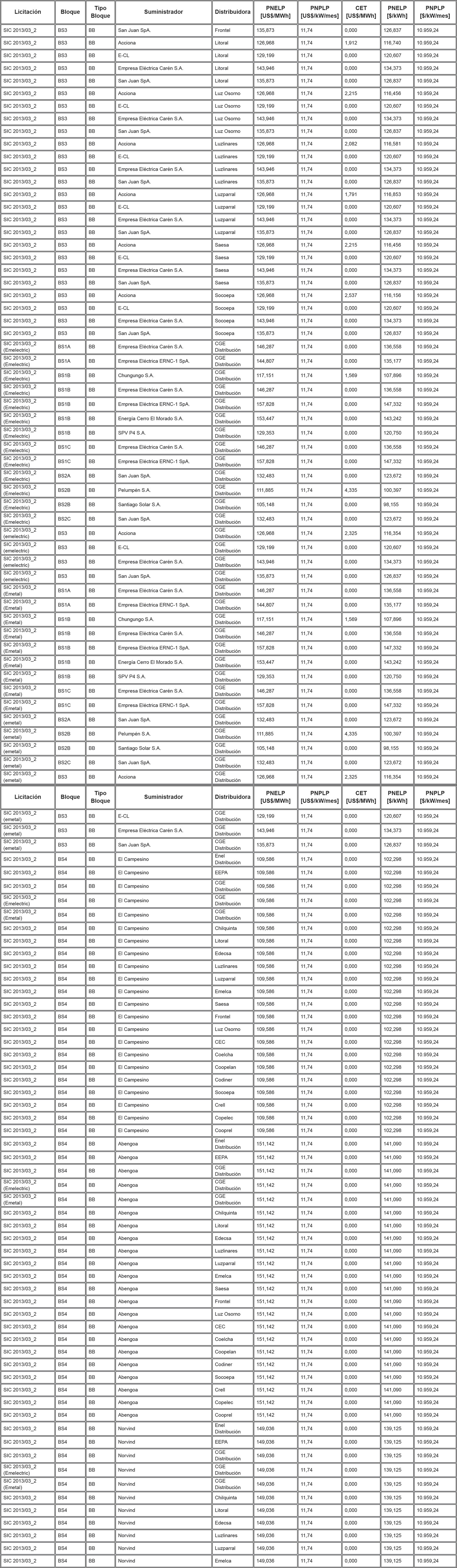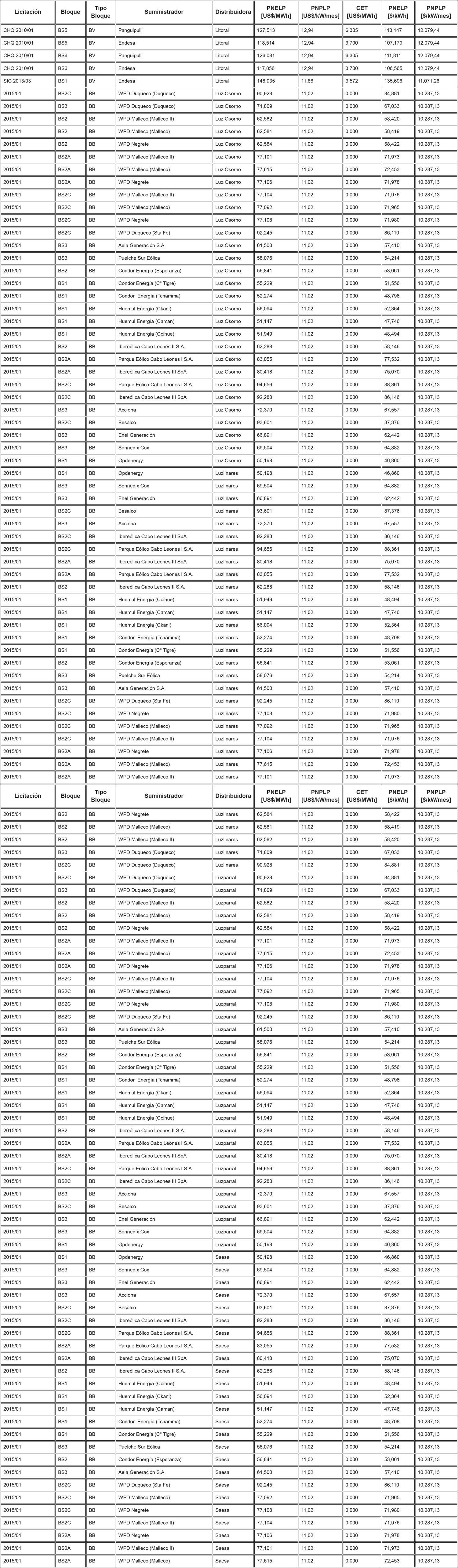 Los Precios de Nudo de Largo Plazo de energía y potencia, de acuerdo con lo señalado en los artículos 6° y 11° de la resolución exenta N° 703, y los descuentos del monto del Cargo Equivalente de Transmisión Final ("CET") en el precio total de energía de los contratos modificados de acuerdo a lo señalado en el artículo vigesimoquinto transitorio, letra E. Numeral i., de la ley N° 20.936 y en la resolución exenta N° 7, son los que se indican en la siguiente tabla: