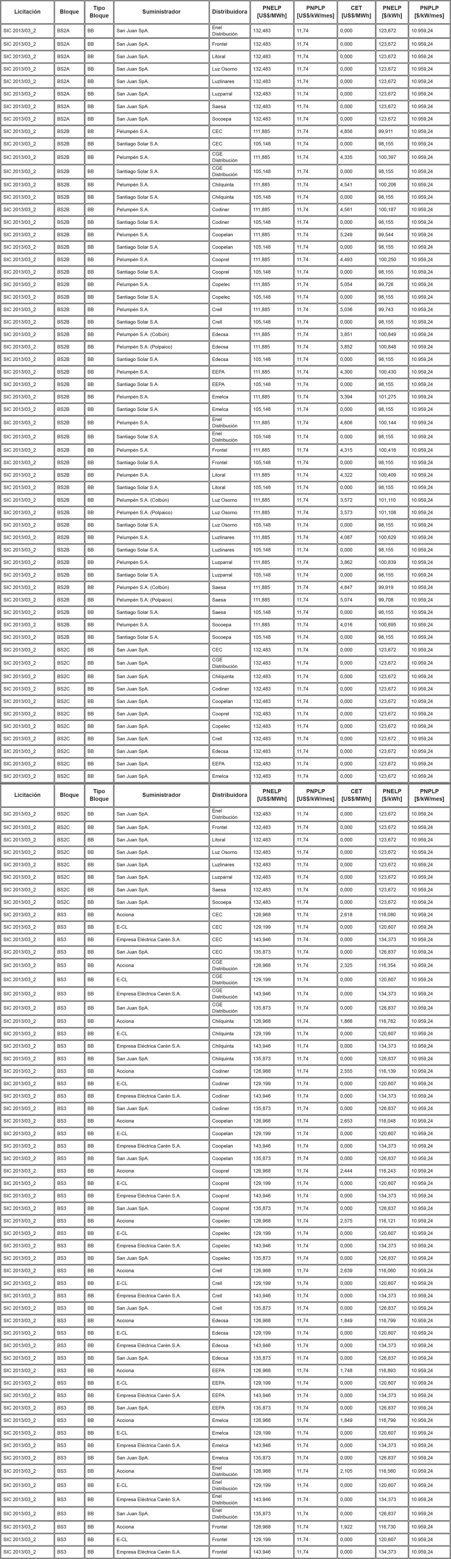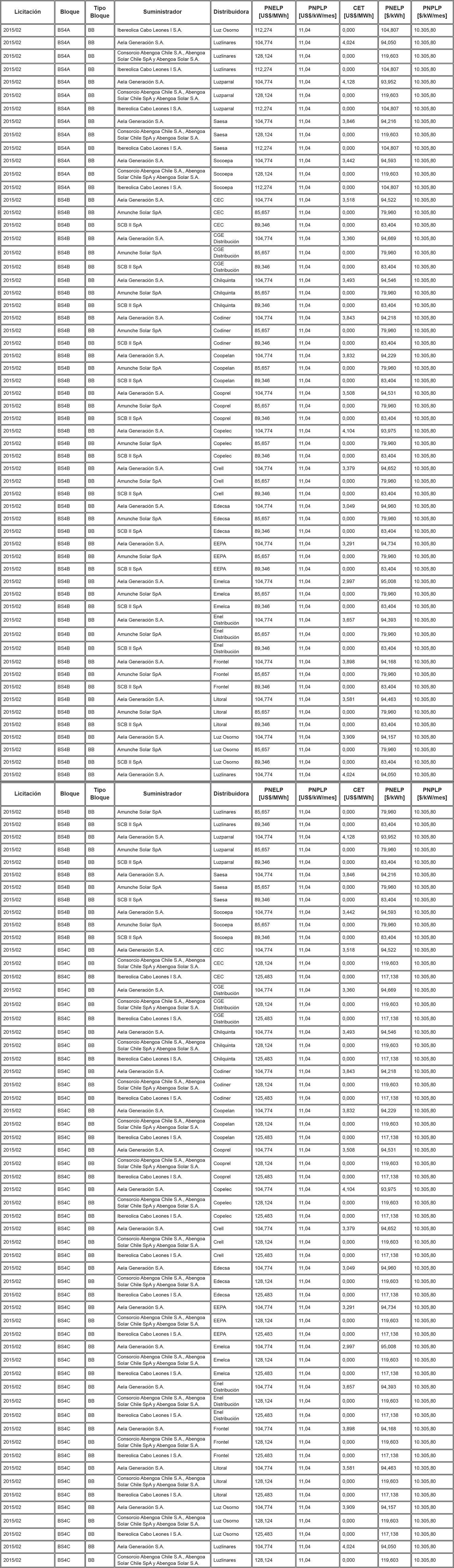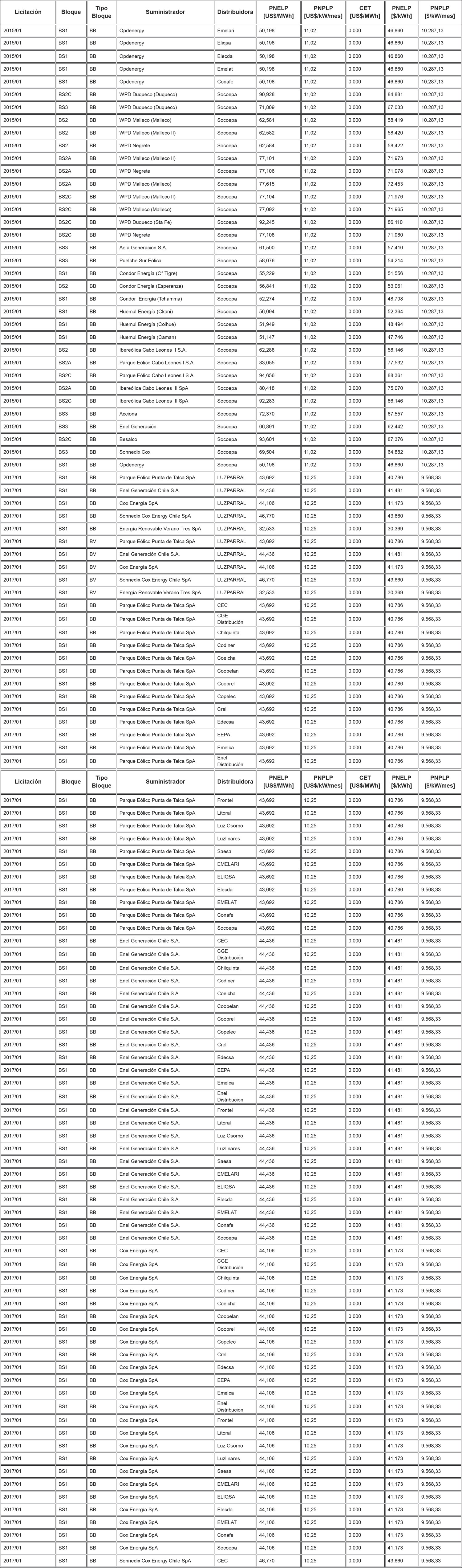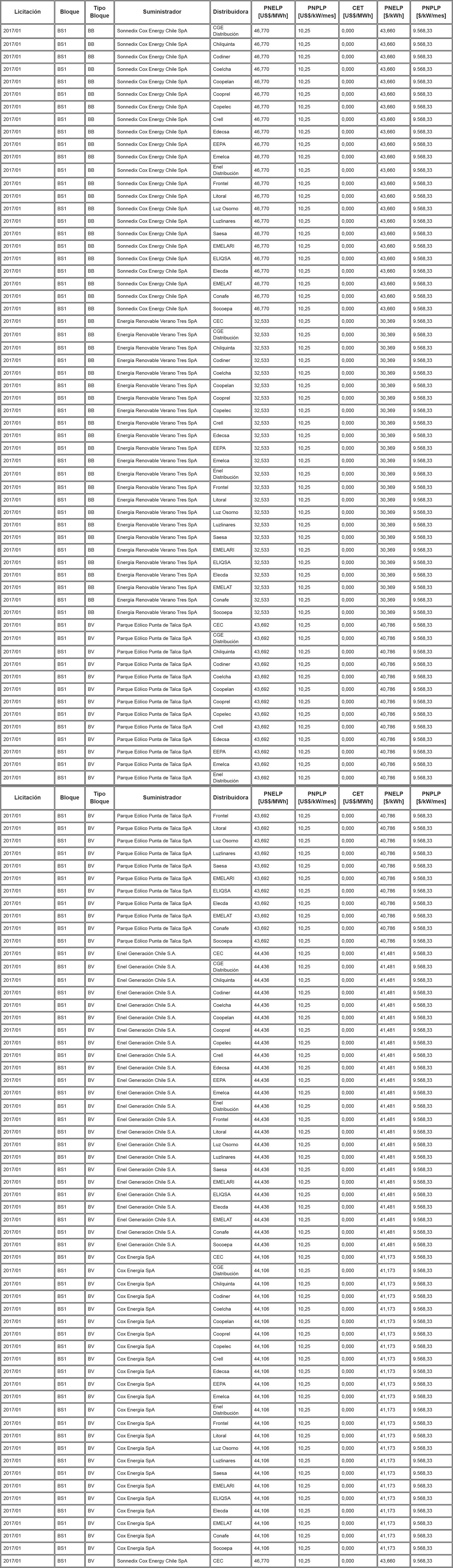 Los Precios de Nudo de Largo Plazo de energía y potencia, de acuerdo con lo señalado en los artículos 6° y 11° de la resolución exenta N° 703, y los descuentos del monto del Cargo Equivalente de Transmisión Final ("CET") en el precio total de energía de los contratos modificados de acuerdo a lo señalado en el artículo vigesimoquinto transitorio, letra E. Numeral i., de la ley N° 20.936 y en la resolución exenta N° 7, son los que se indican en la siguiente tabla: