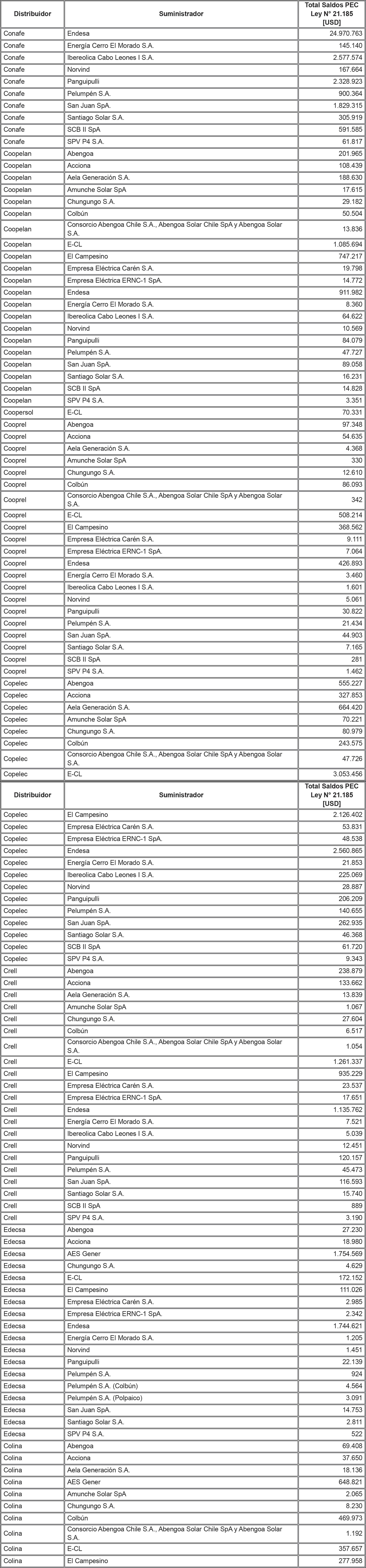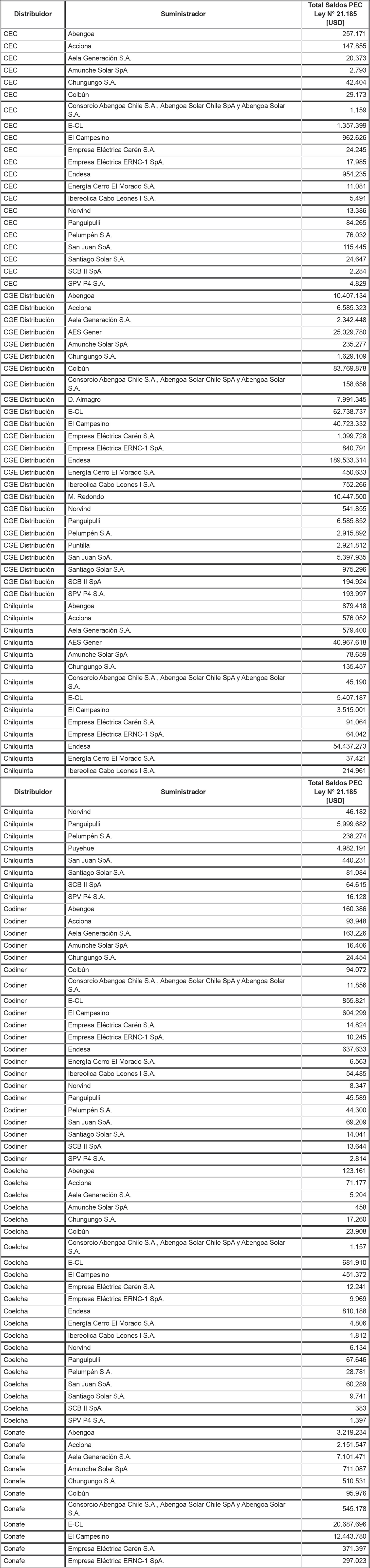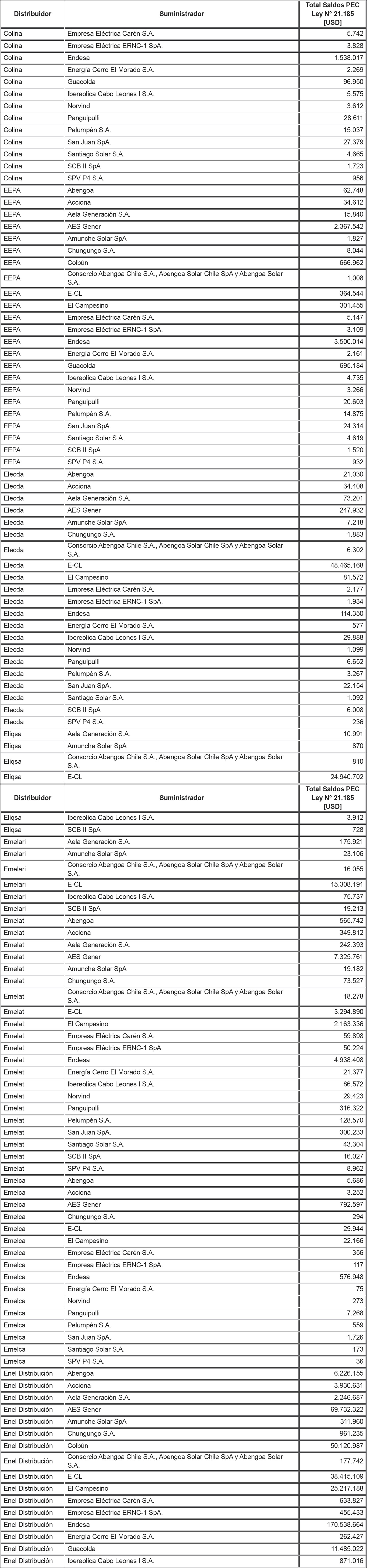 De acuerdo a lo señalado precedentemente, la siguiente tabla contiene los saldos antes mencionados del Sistema Eléctrico Nacional, identificando al suministrador acreedor de dichos saldos y la Distribuidora deudora correspondiente: