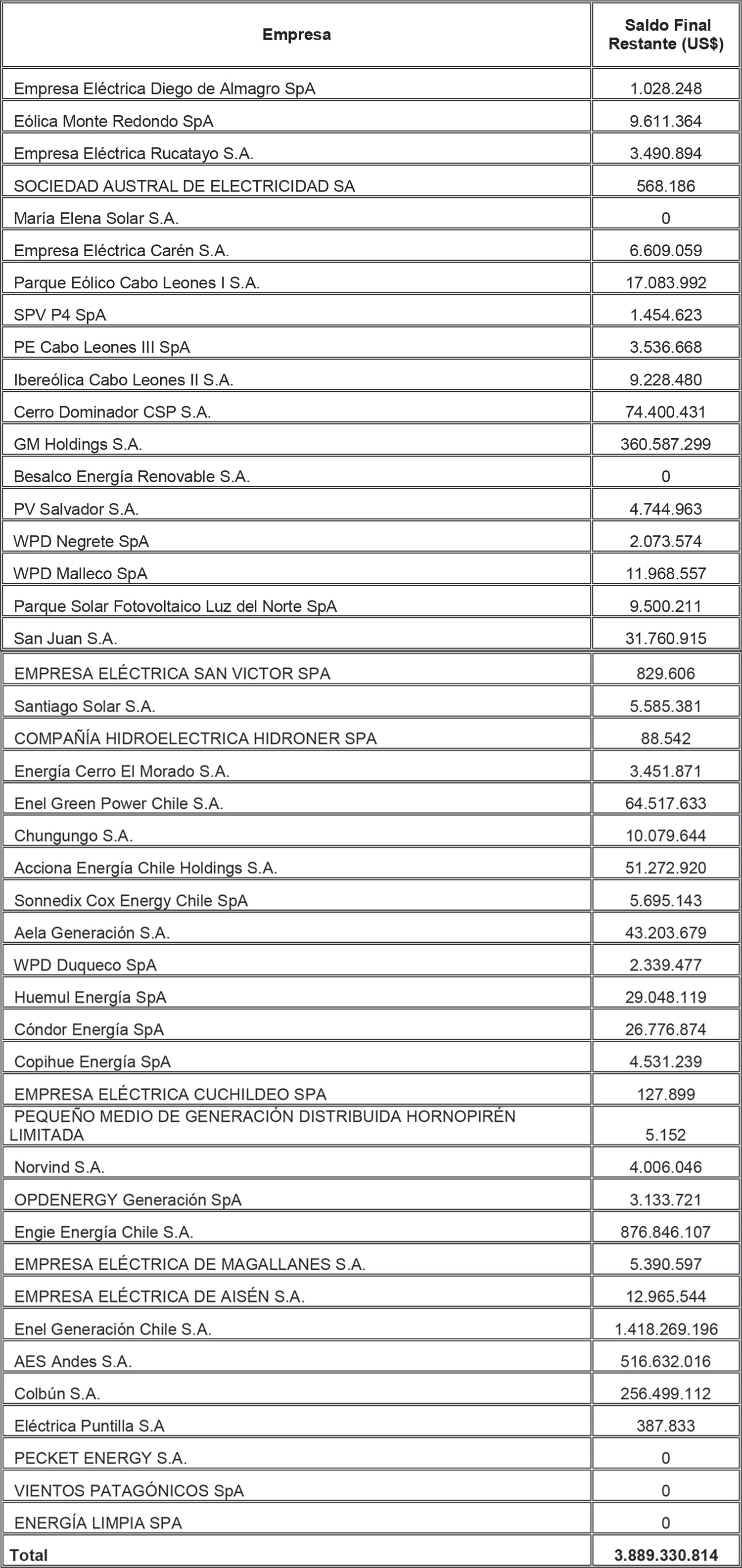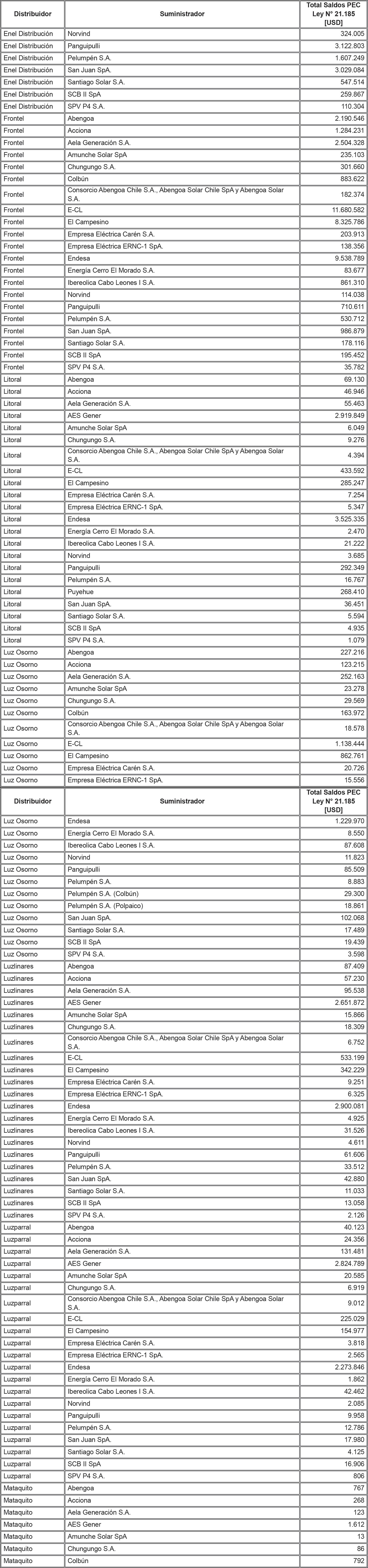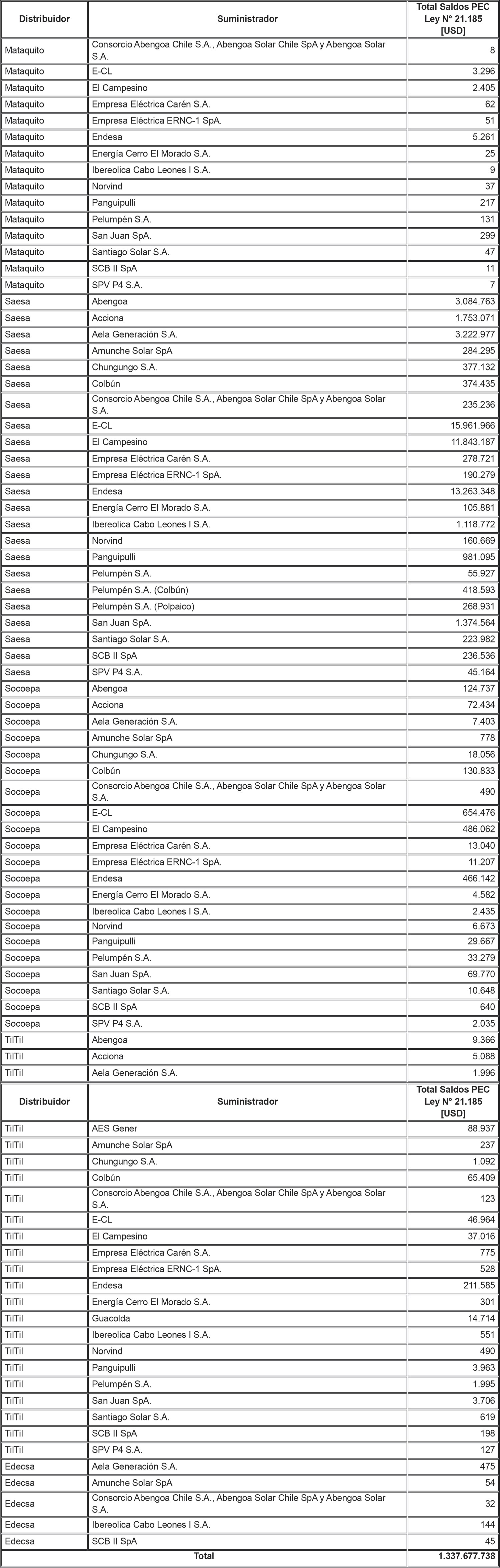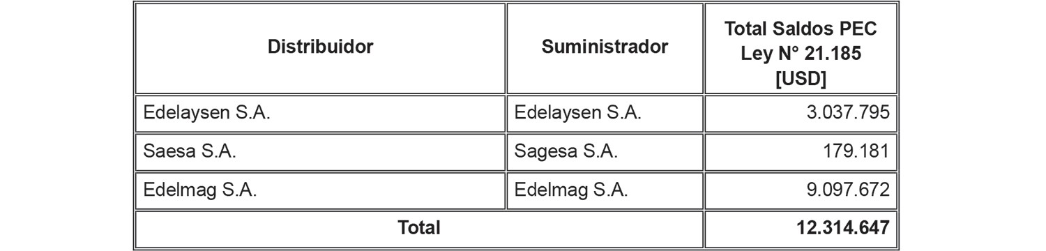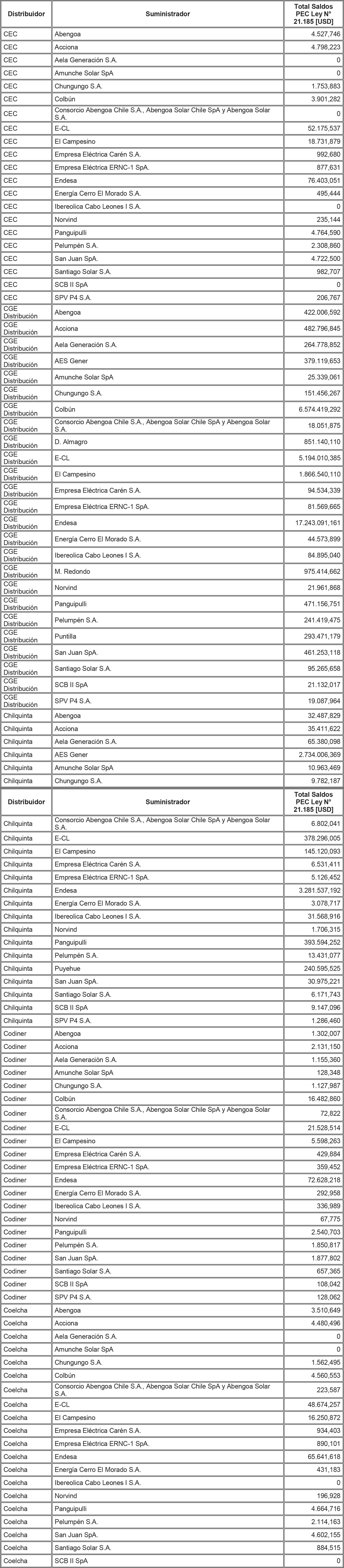 De acuerdo a lo señalado precedentemente, la siguiente tabla contiene los saldos antes mencionados del Sistema Eléctrico Nacional, identificando al suministrador acreedor de dichos saldos y la Distribuidora deudora correspondiente: