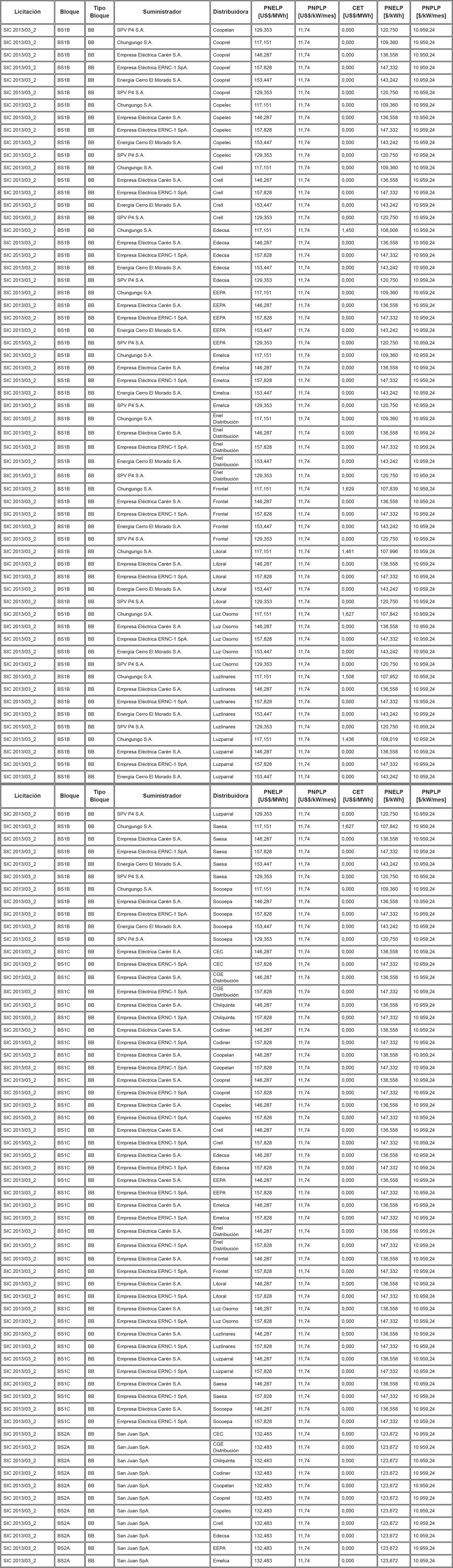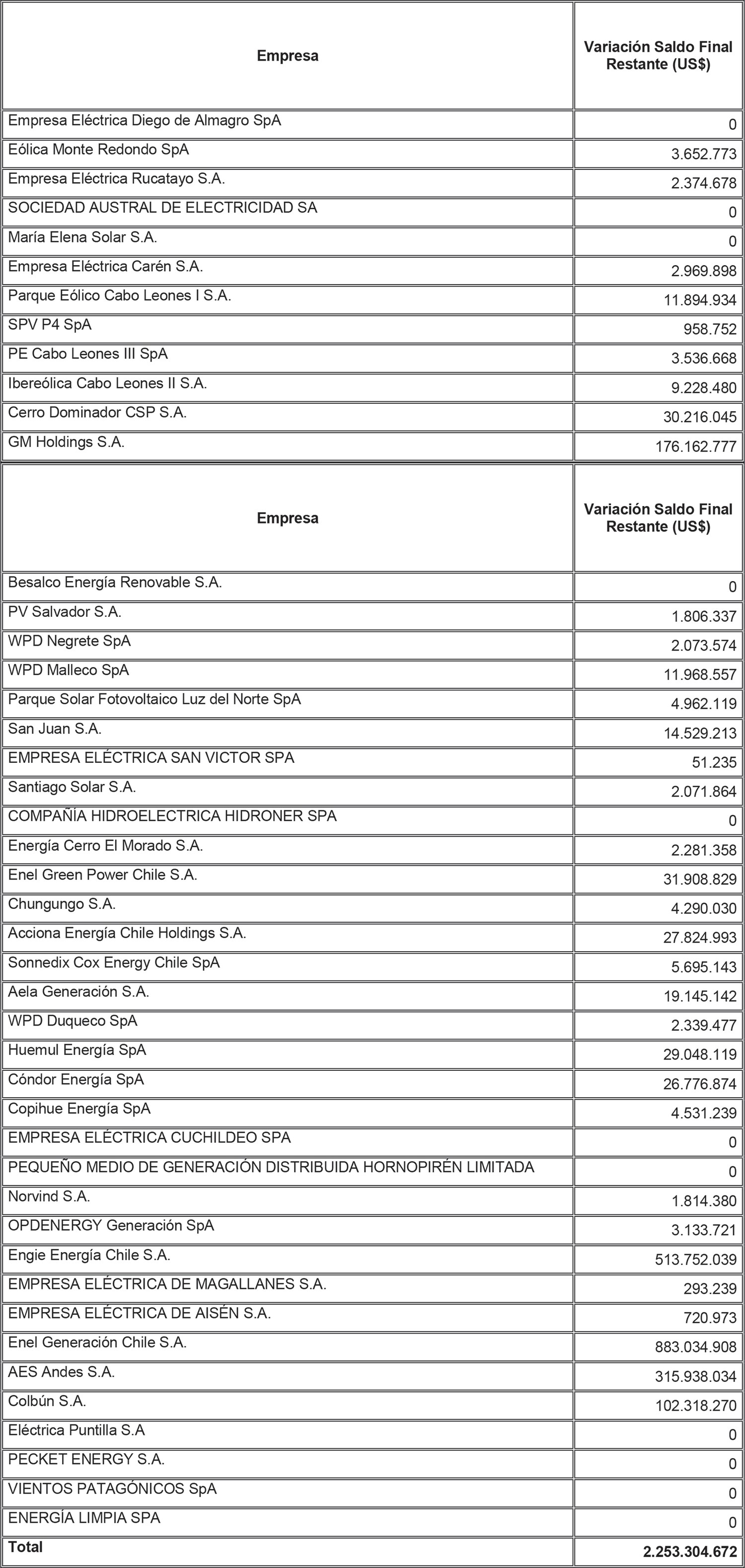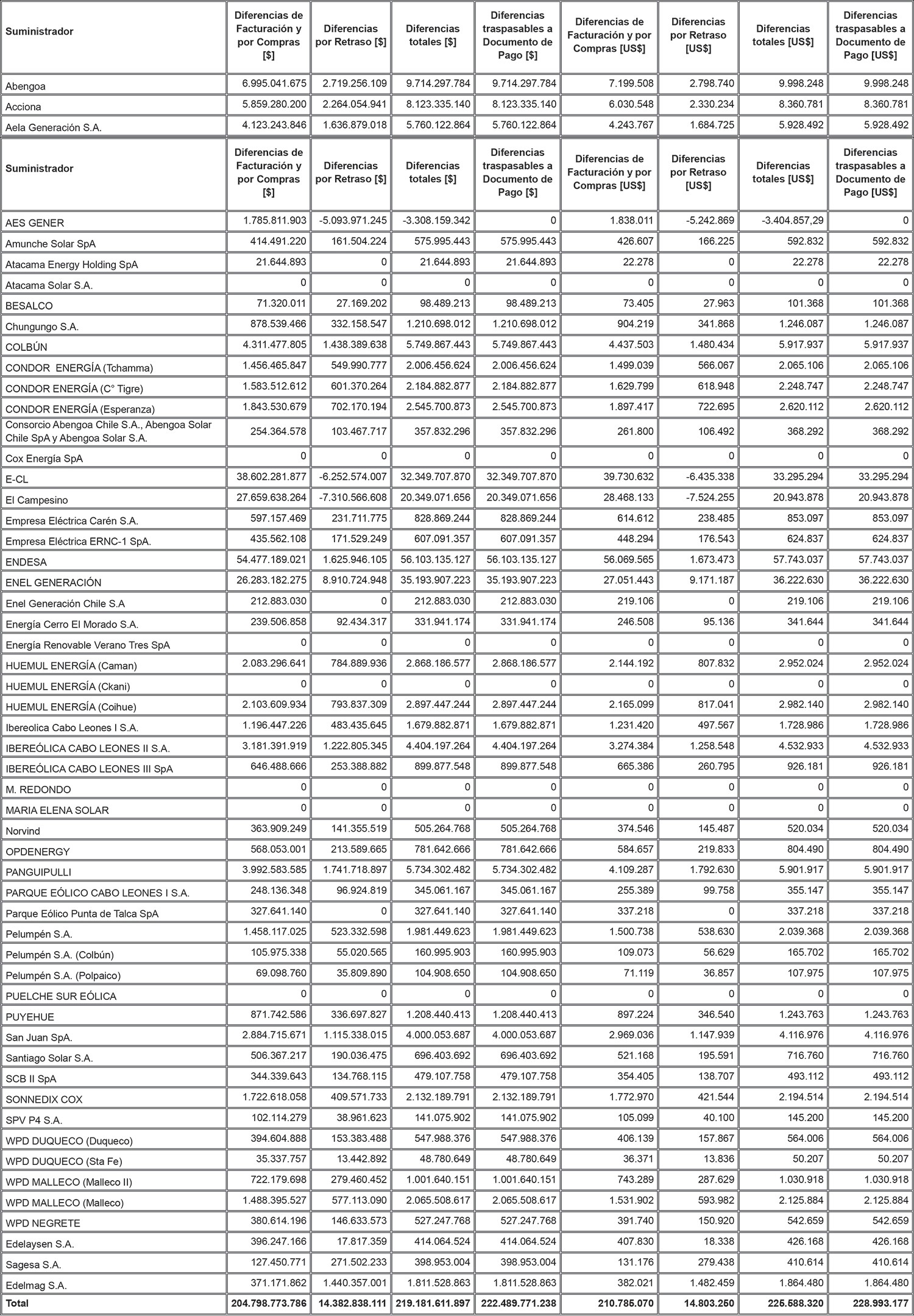 De acuerdo a lo señalado precedentemente, la siguiente tabla contiene los saldos antes mencionados del Sistema Eléctrico Nacional, identificando al suministrador acreedor de dichos saldos y la Distribuidora deudora correspondiente: