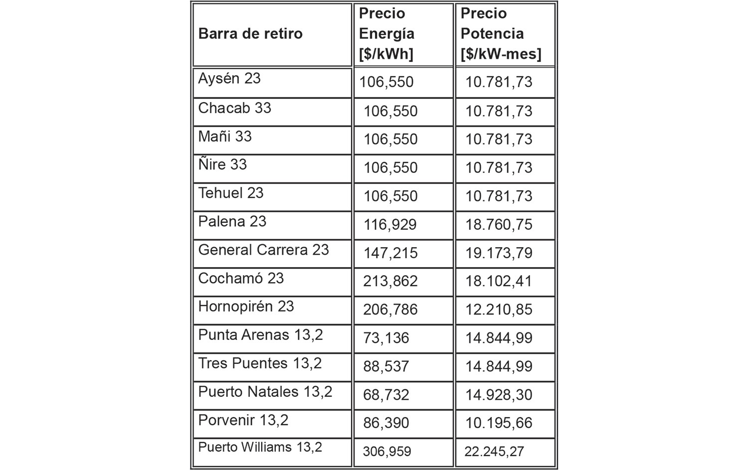 En los sistemas medianos de Punta Arenas, Puerto Natales, Porvenir y Puerto Williams y de Aysén, Palena y General Carrera, los precios de nudo de energía y potencia de punta que se aplicarán a los suministros servidos en la barra de retiro para el nivel de tensión que se indica, corresponden a los indicados en la Tabla 2.