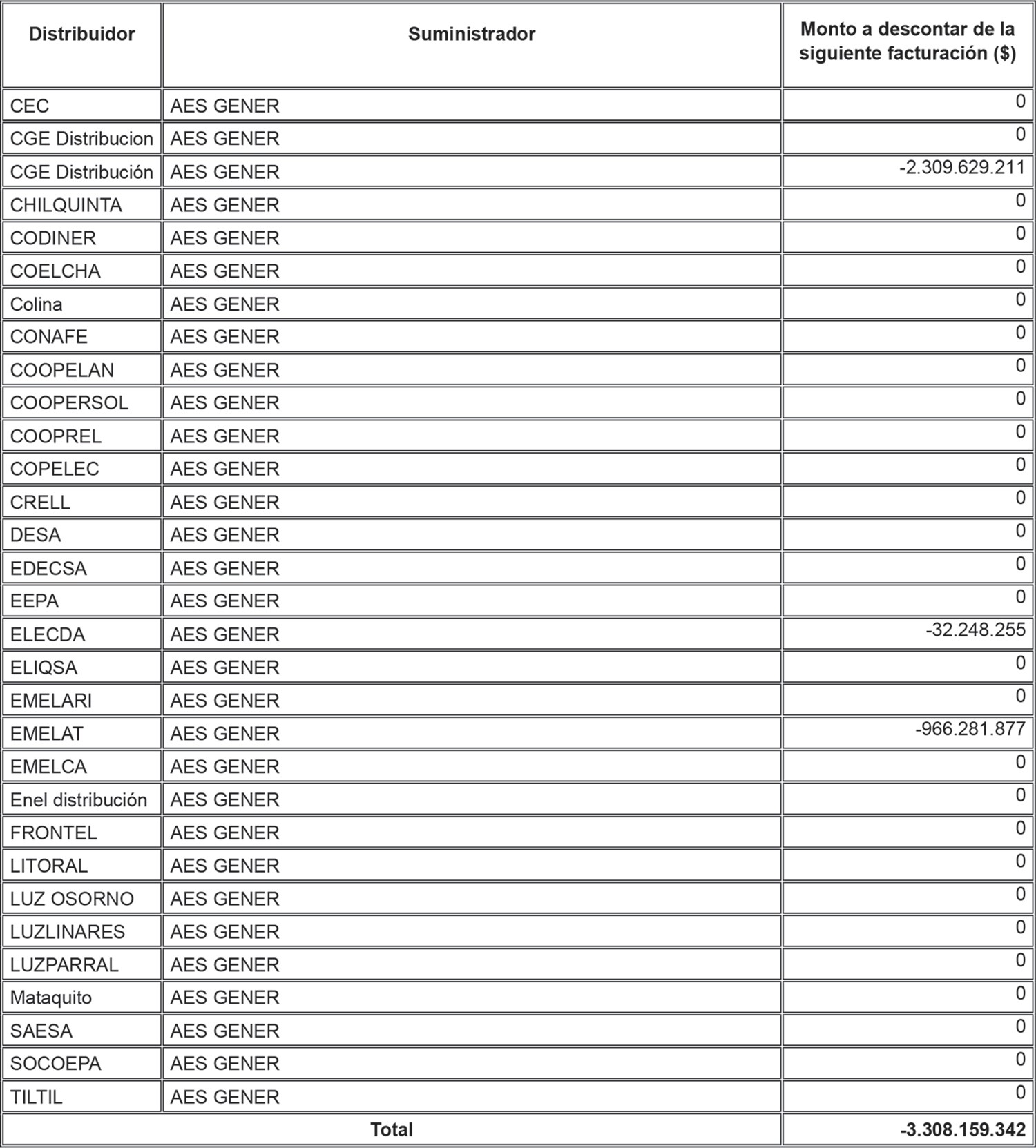 Al consolidar todas las diferencias de facturación no remuneradas, se constata un suministrador que presenta un monto negativo, originado en Diferencias por Retraso del decreto, el cual se debe devolver a las empresas distribuidoras a través de descuentos en la facturación, conforme a lo dispuesto en el artículo 19 del artículo segundo de la resolución exenta N° 379. Dichos montos consolidados fueron asignados a las empresas distribuidoras que deben realizar los descuentos, a proporción del descuento contabilizado para cada distribuidora previo a la consolidación de saldos. Acorde a lo descrito anteriormente, a continuación, se muestran los descuentos que deben realizar las empresas distribuidoras a los suministradores con diferencias de facturación no remuneradas netas negativas.