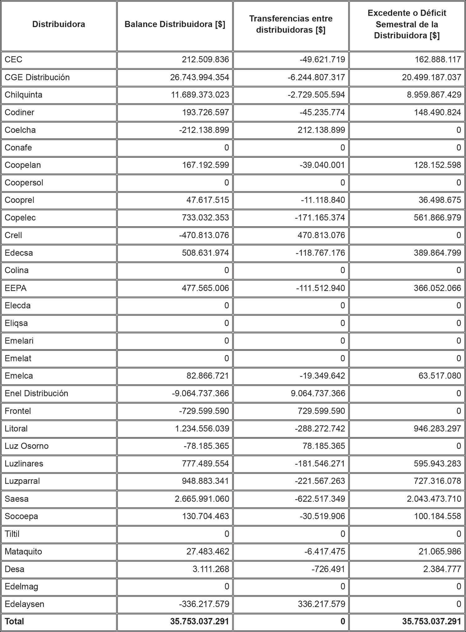 Conforme a lo anterior, en la tabla siguiente se detalla el resultado del Balance de la Distribuidora, las transferencias entre Distribuidoras y el Excedente o Déficit semestral de la Distribuidora resultante de tal ejercicio.