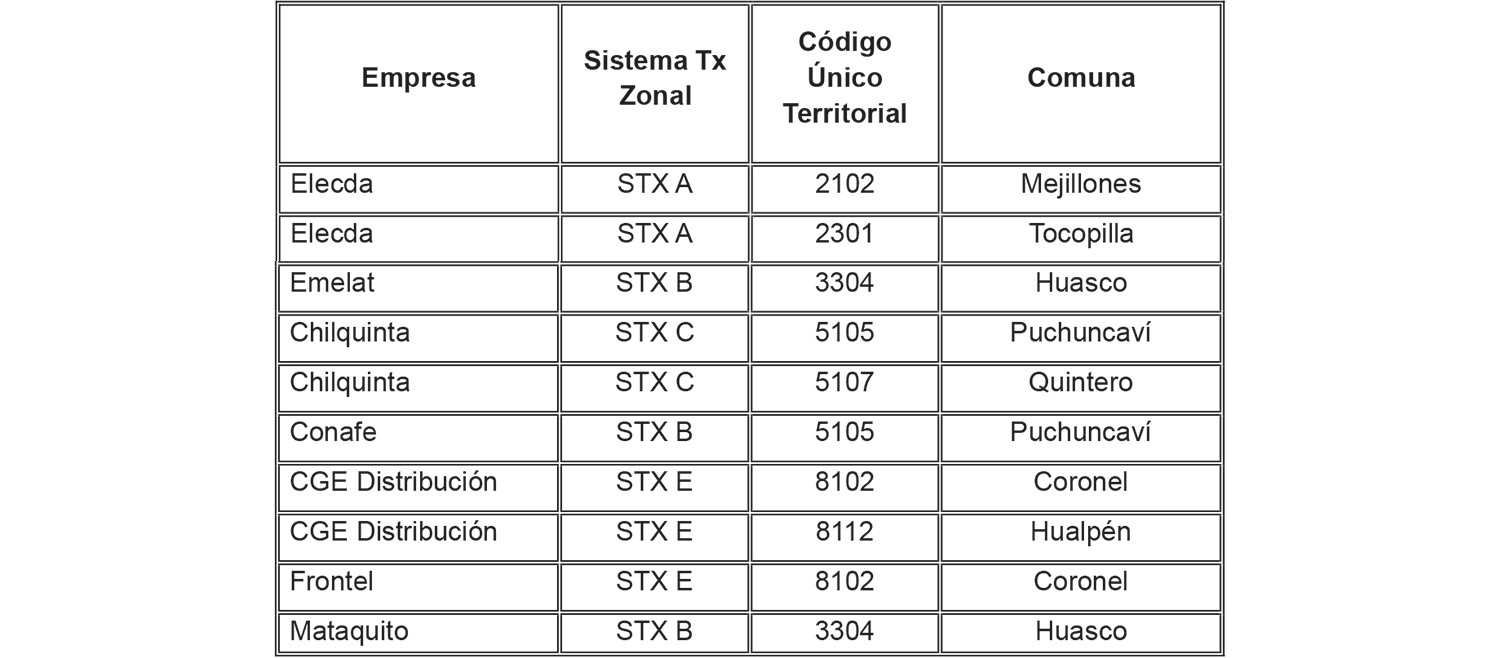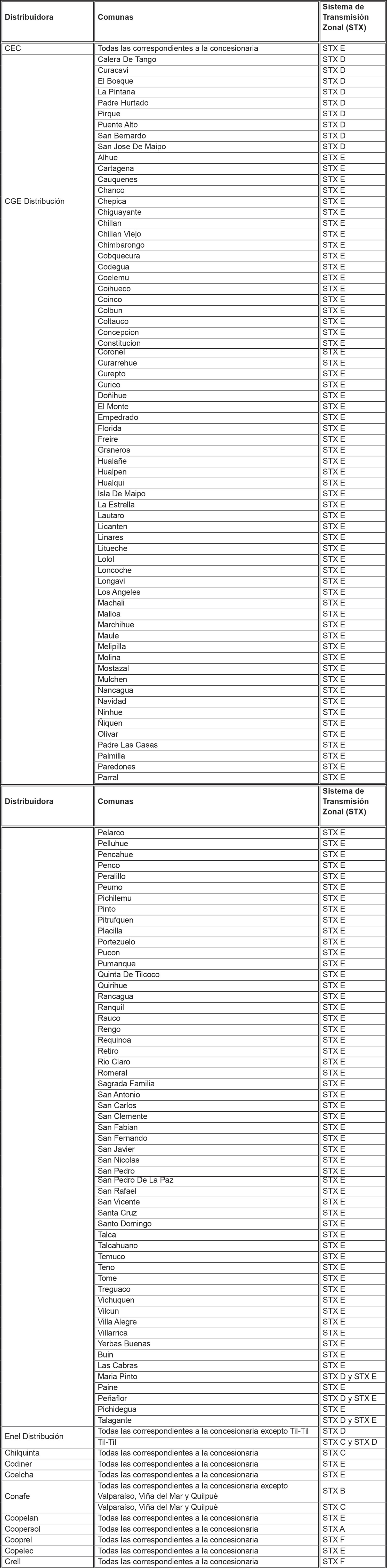 Tabla 11: Comunas por sistema de transmisión zonal