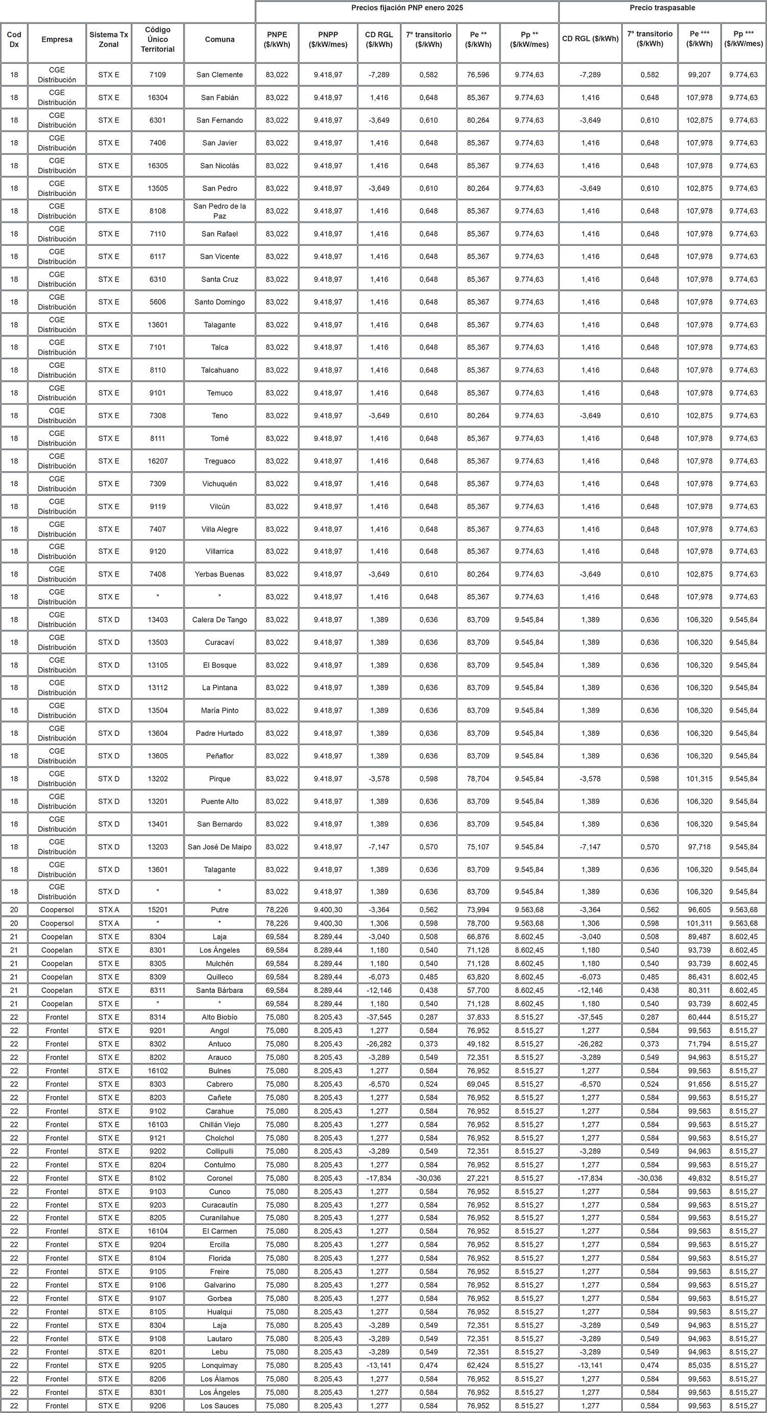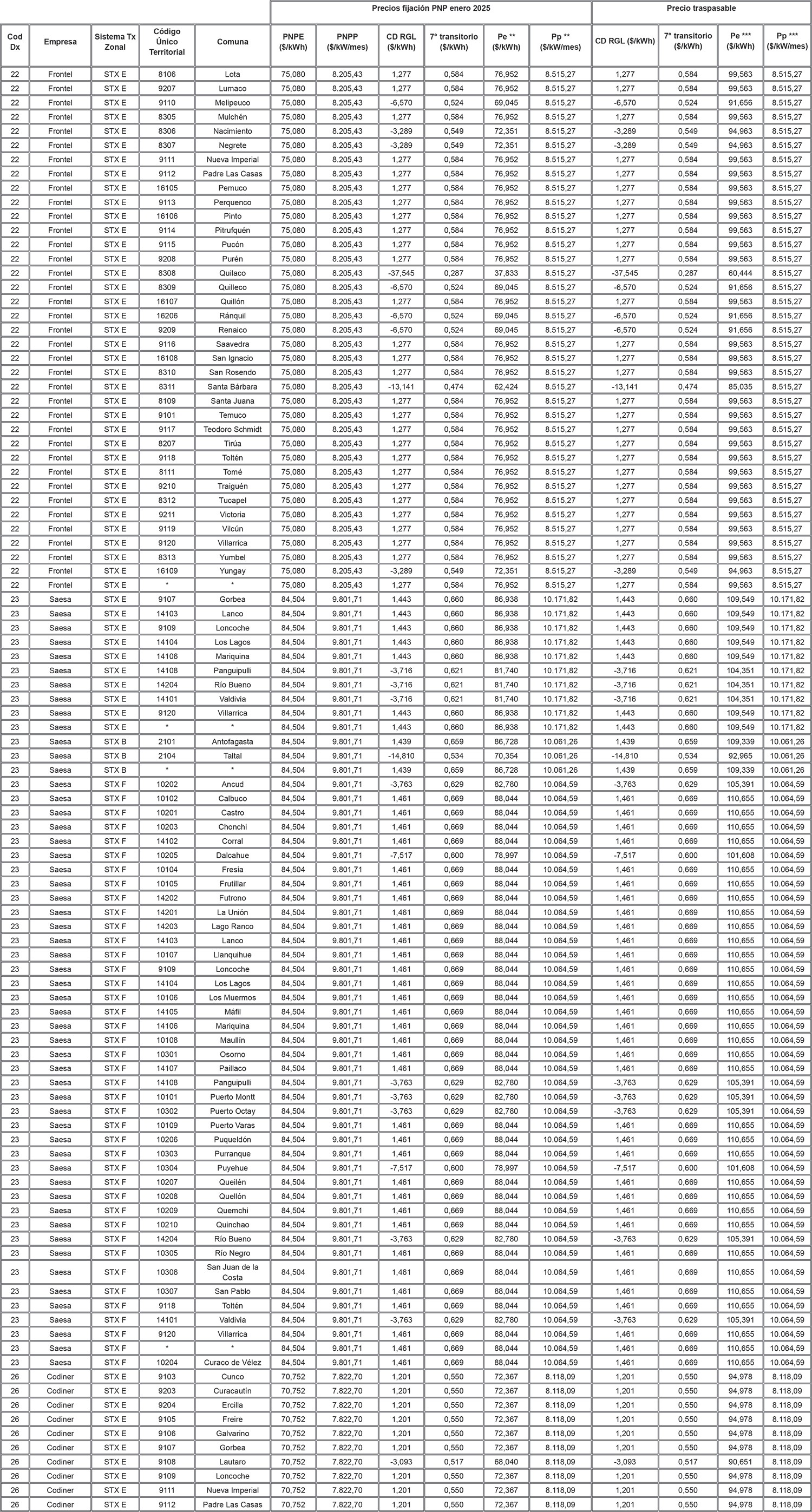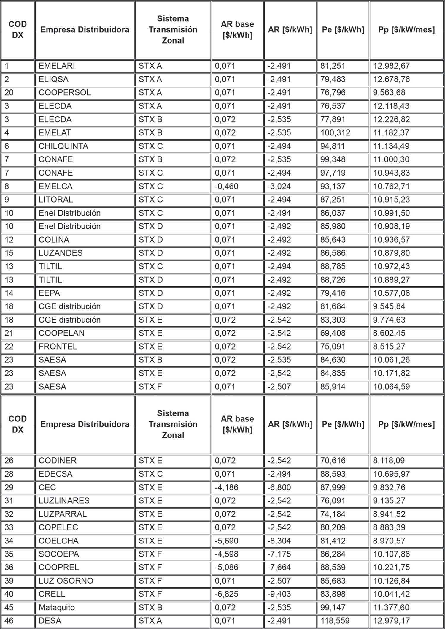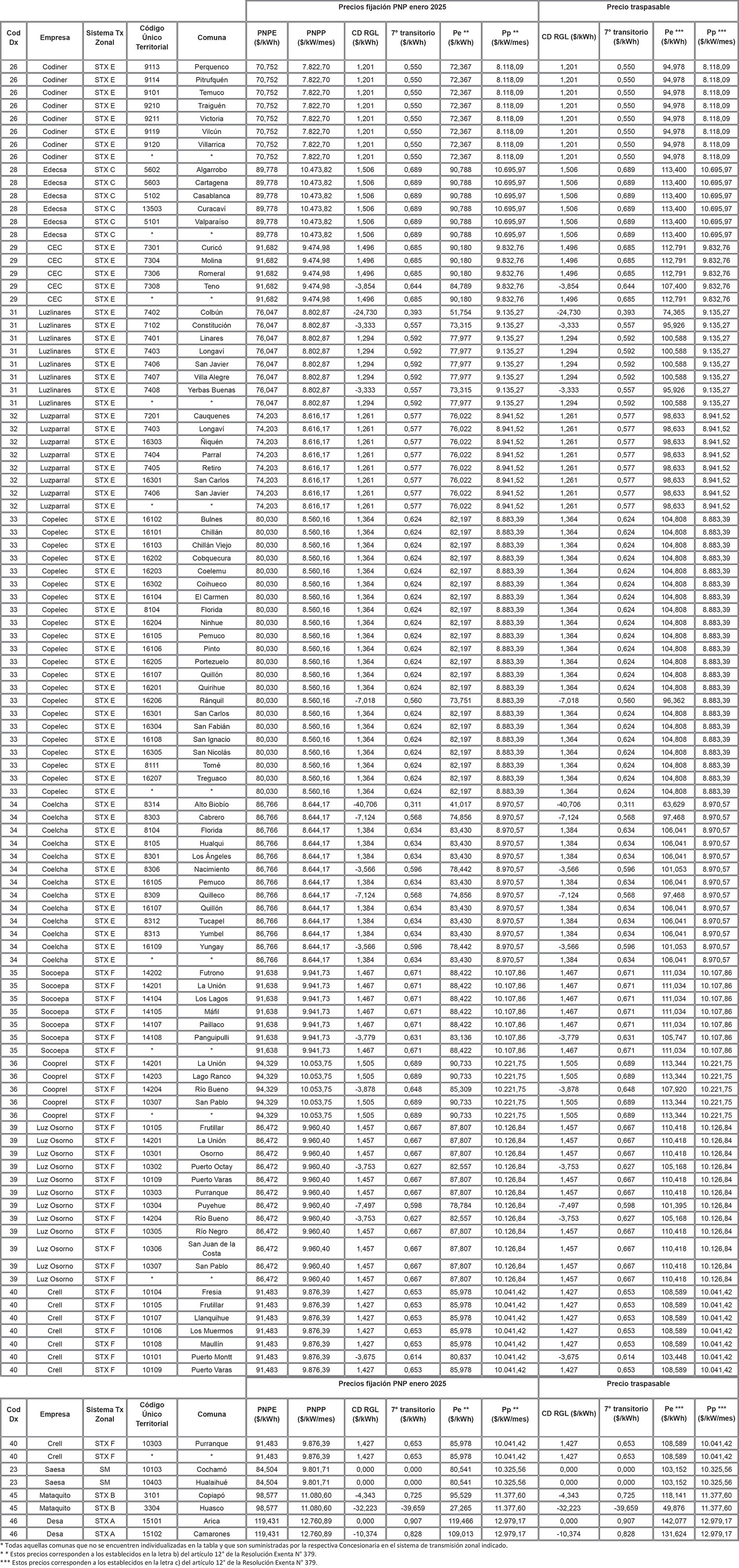 Los valores que las Distribuidoras podrán traspasar a sus Clientes Regulados se indican en la Tabla 14 para cada Distribuidora y sector de nudo asociado al sistema de transmisión zonal en donde se ubica el cliente respectivo, considerando la siguiente clasificación para las empresas distribuidoras presentes en más de un sector de nudo: