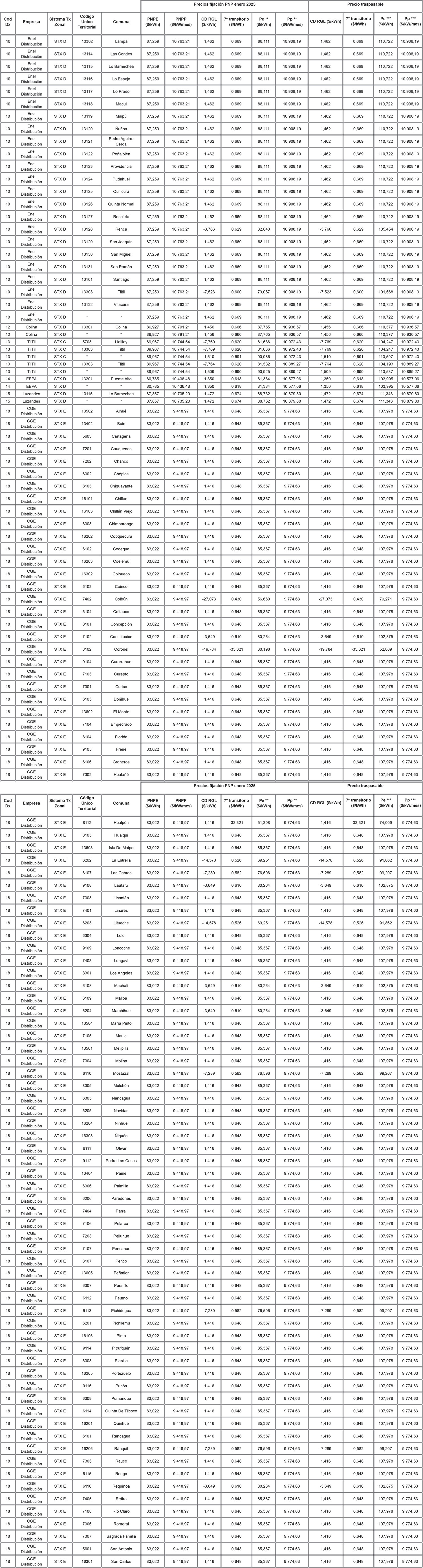 En la Tabla 15, los valores correspondientes a "Precios fijación PNP enero 2025" se obtienen aplicando los factores Ni, que se señalan en la tabla siguiente: