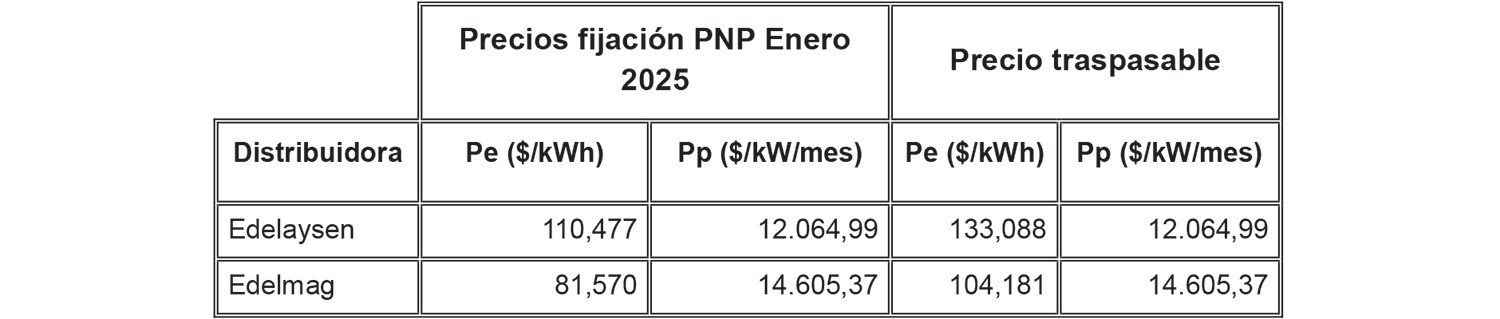 Los precios de energía a nivel de distribución traspasables a Clientes Regulados por las Distribuidoras Edelaysen y Edelmag son los que se establecen a continuación: