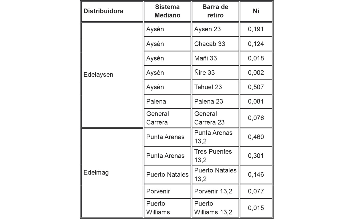 Tabla 16: Ponderadores Ni para precios traspasables a cliente final en los sistemas medianos