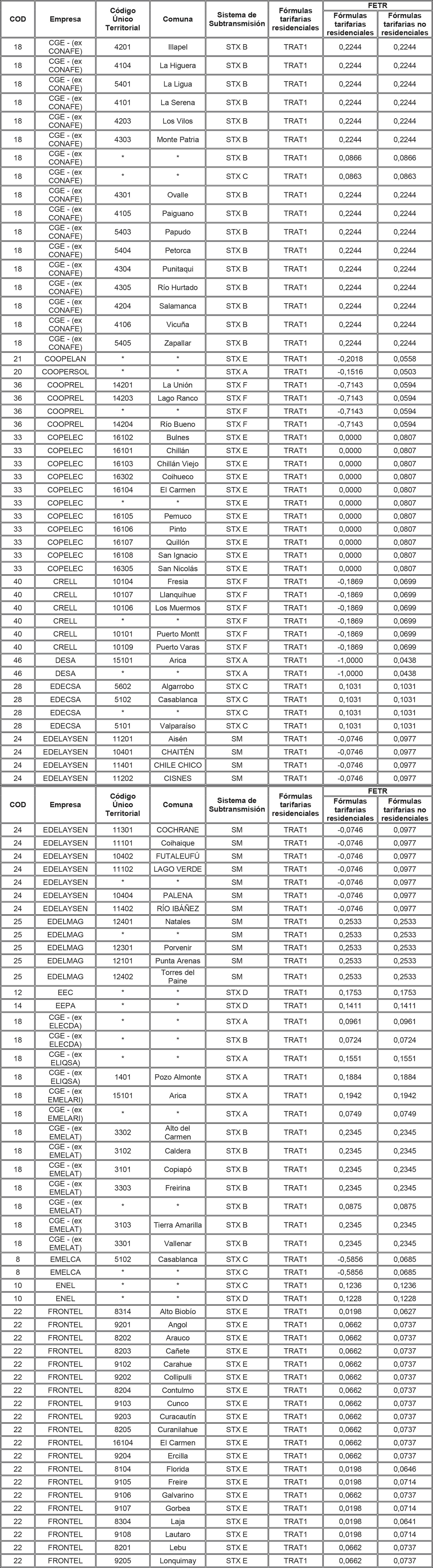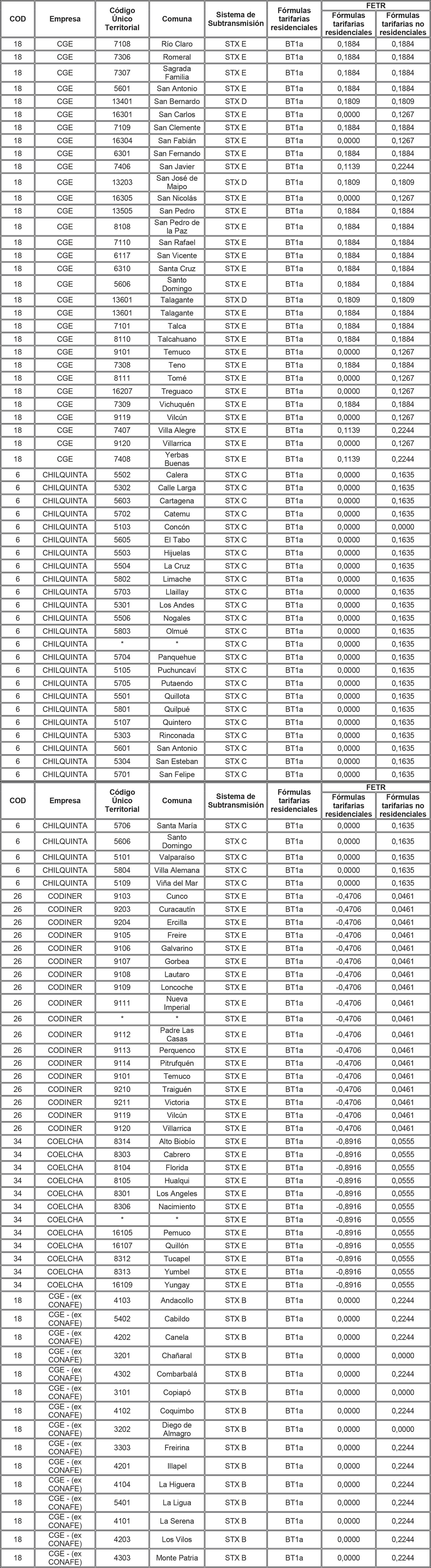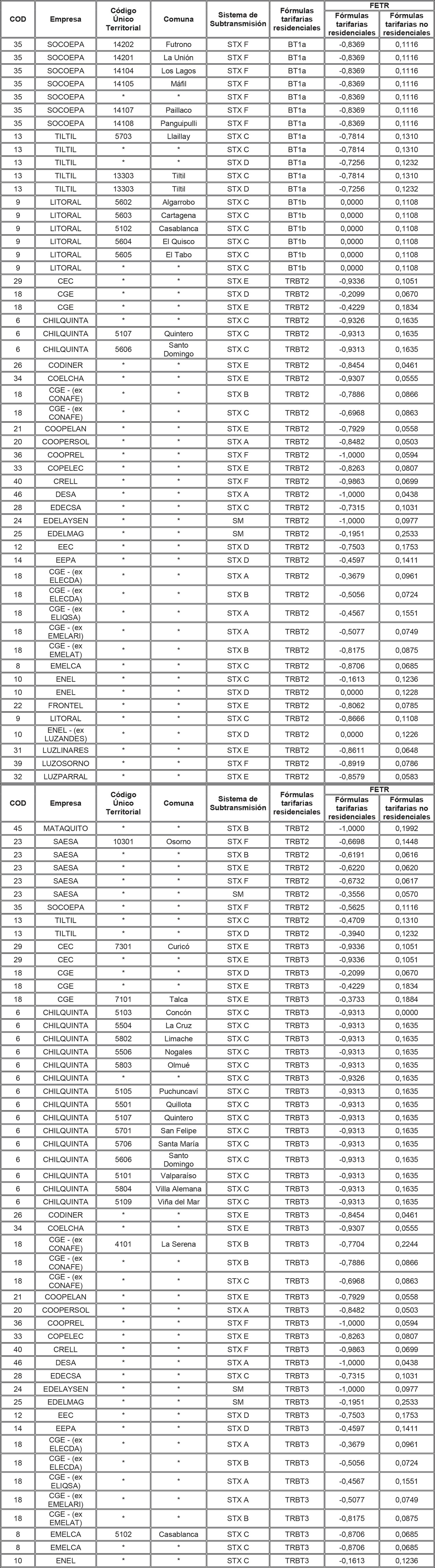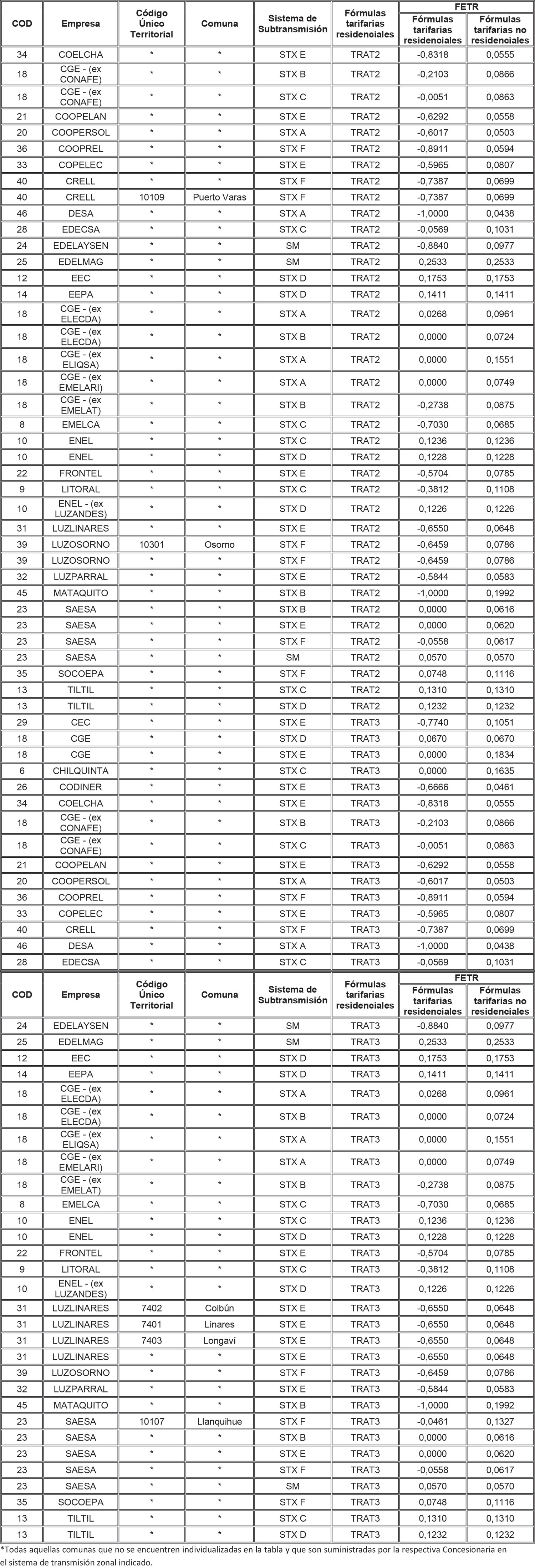 Para aquellas combinaciones empresa/comuna/sistema de transmisión zonal que no tienen asignado en la tabla anterior un FETR para alguna de las tarifas residenciales, se deberá aplicar el FETR determinado para la combinación empresa/sistema de transmisión zonal/tarifa, determinado para aquellas comunas no individualizadas (es decir, que presentan un * en la columna Comuna de la tabla anterior).